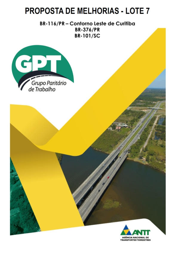 Os Grupos Paritários de Trabalho - GPTs foram instituídos, no âmbito das Concessões Rodoviárias administradas pela Agência Nacional de Transportes Terrestres - ANTT. O presente documento consolida as recomendações e sugestões do GPT do Lote 7, nos trabalhos até aqui desenvolvidos, acompanhadas das justificativas, traduzidas na proposta de um conjunto de intervenções físicas e operacionais de melhoria a serem incorporadas ao Plano de Exploração Rodoviária - PER das rodovias do Lote 7.