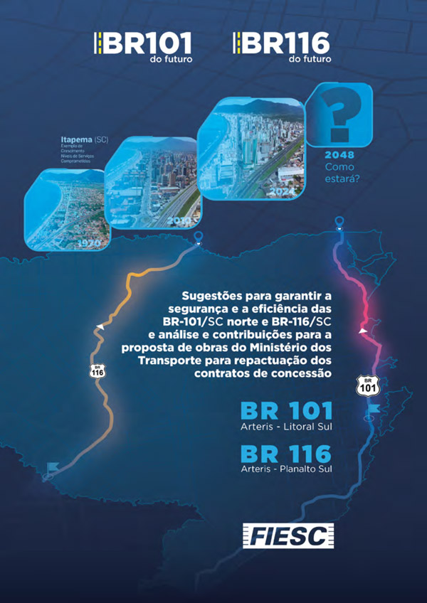 A FIESC, ciente do impacto da logística na competitividade, publica mais um trabalho, o qual incorpora as diretrizes consolidadas pelo GT BR 101 do Futuro, com o objetivo de definir uma pauta estratégica para garantir a segurança, fluidez e integridade deste importante eixo litorâneo catarinense.