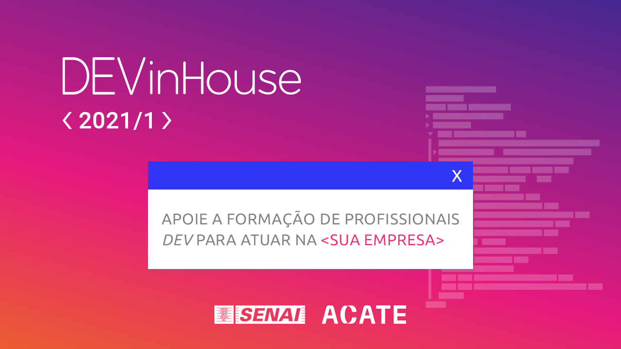 Florianópolis, 2.3.2021 - Empresas catarinenses de tecnologia terão a oportunidade de ajudar na formação de novos desenvolvedores de software, profissionais entre os mais buscados e em falta no setor. O SENAI e a Associação Catarinense de Tecnologia (ACATE) estão lançando novas turmas do projeto DEVinHouse. O programa se dedica a formar desenvolvedores em nove meses. Nesta quinta-feira (4), às 18h, as entidades realizam o evento de lançamento para as empresas interessadas, que terão a oportunidade de patrocinar as turmas e contratar os profissionais ao final do ciclo. As inscrições para acompanhar o evento podem ser feitas aqui.