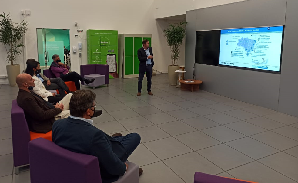 Nesta segunda-feira (27), a equipe da AEB e o deputado Daniel de Freitas estiveram na FIESC, onde se reuniram com o presidente da Federação, Mario Cezar de Aguiar, o diretor de inovação e competitividade, José Eduardo Fiates, e o diretor de educação e tecnologia, Fabrizio Machado Pereira.
