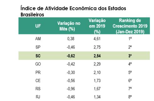 Florianópolis, 17.2.2020 – O Índice de Atividade Econômica Regional de Santa Catarina (IBCr-SC) cresceu 2,54% em 2019, mostram os dados do Banco Central, divulgados pelo Observatório FIESC. Entre as unidades da federação que possuem indicadores de atividade econômica, o desempenho catarinense ficou em terceiro lugar, atrás do Amazonas e São Paulo, que apresentaram crescimento de 4,6% e 2,7%, respectivamente. No período, o Brasil cresceu 0,89%. Veja aqui a pesquisa completa