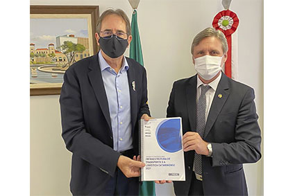 Florianópolis, 24.2.2021 - O presidente da Federação das Indústrias (FIESC), Mario Cezar de Aguiar, entregou ao senador Dário Berger a Agenda Estratégica para Infraestrutura e a Logística Catarinense 2021. O parlamentar vai presidir a Comissão de Serviços de Infraestrutura do Senado. O encontro foi realizado nesta quarta-feira, dia 24, em Brasília. O documento é atualizado pela FIESC anualmente e reúne as demandas catarinenses na área. É de R$ 19,9 bilhões o valor estimado pela entidade dos investimentos necessários nos próximos quatro anos para garantir competitividade padrão mundial à economia do estado.