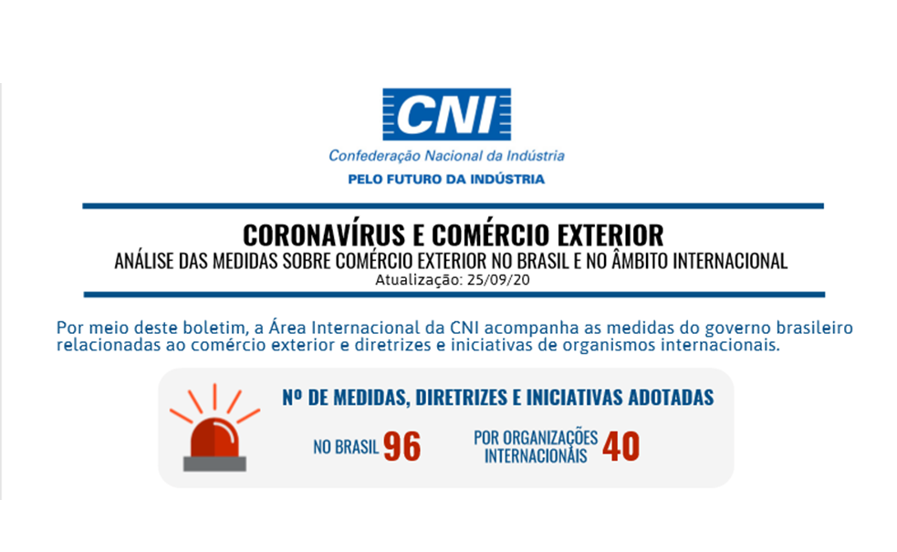 As medidas adotadas estão sendo acompanhadas pela Área Internacional da CNI desde março e serão enviadas periodicamente para o setor empresarial.