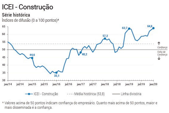 De acordo com a Sondagem Indústria da Construção, todos os índices de expectativas dos empresários aumentaram em janeiro frente a dezembro e continuam bem acima dos 50 pontos. Isso indica que há a perspectiva de aumento do nível de atividade, de novos empreendimentos serviços e do emprego no setor nos próximos seis meses.