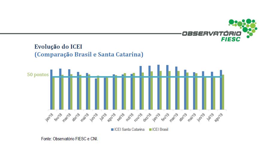 Florianópolis, 20.8.2019 – O índice de confiança do empresário industrial catarinense (ICEI) passou de 57,8 pontos em julho para 60,5 pontos em agosto, aumento de 2,7 pontos. É o primeiro aumento do indicador após duas quedas consecutivas, sinalizando retomada da trajetória de crescimento da confiança dos empresários do estado, mostra pesquisa da FIESC. No Brasil, o ICEI ficou em 59,4 pontos, dois pontos acima do registrado em julho. Veja aqui os dados completos