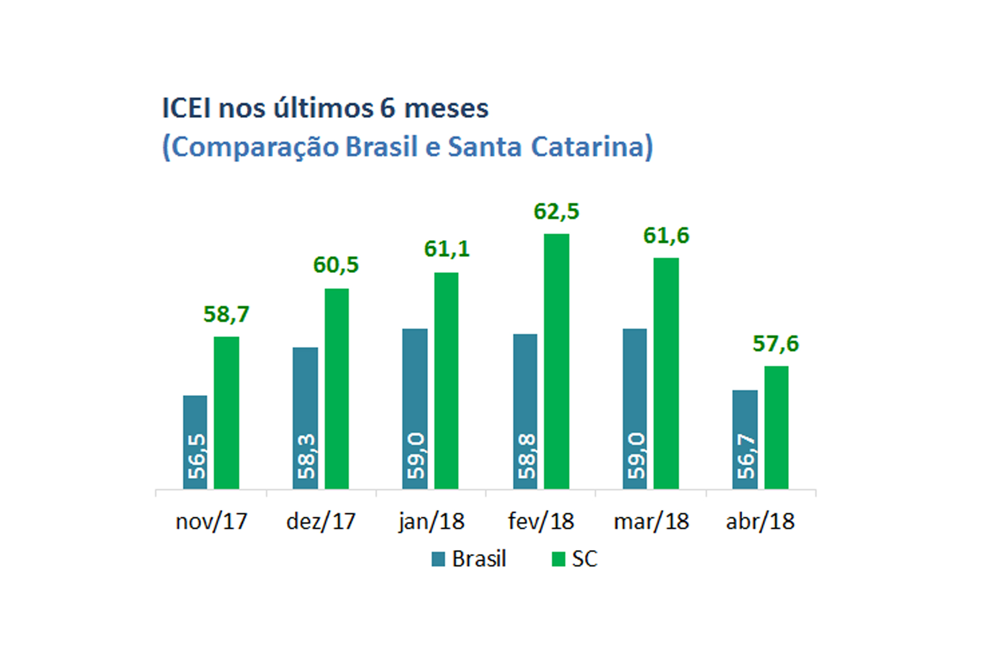 Índice nacional - No caso brasileiro, a redução do indicador também foi observada. O ICEI de abril ficou em 56,7 pontos, um recuo de 2,3 pontos em relação ao mês anterior. O índice situa-se 2,5 pontos acima de sua média histórica (54,2 pontos) e mostra crescimento de 3,6 pontos na comparação com abril de 2017.