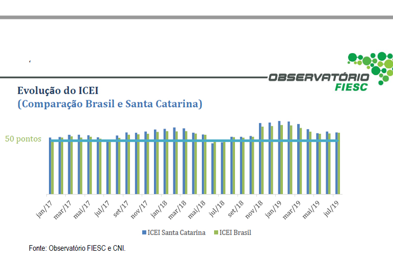 Florianópolis, 18.7.2019 – O Índice de Confiança do Empresário Industrial Catarinense (ICEI) passou de 58,6 pontos em junho para 57,8 pontos em julho, leve recuo de 0,8 ponto. A diminuição do otimismo foi influenciada pela piora da percepção dos empresários quanto às condições atuais e pela queda das expectativas futuras. No Brasil, o ICEI ficou em 57,4 pontos, meio ponto acima do registrado em junho. Veja aqui os dados completos