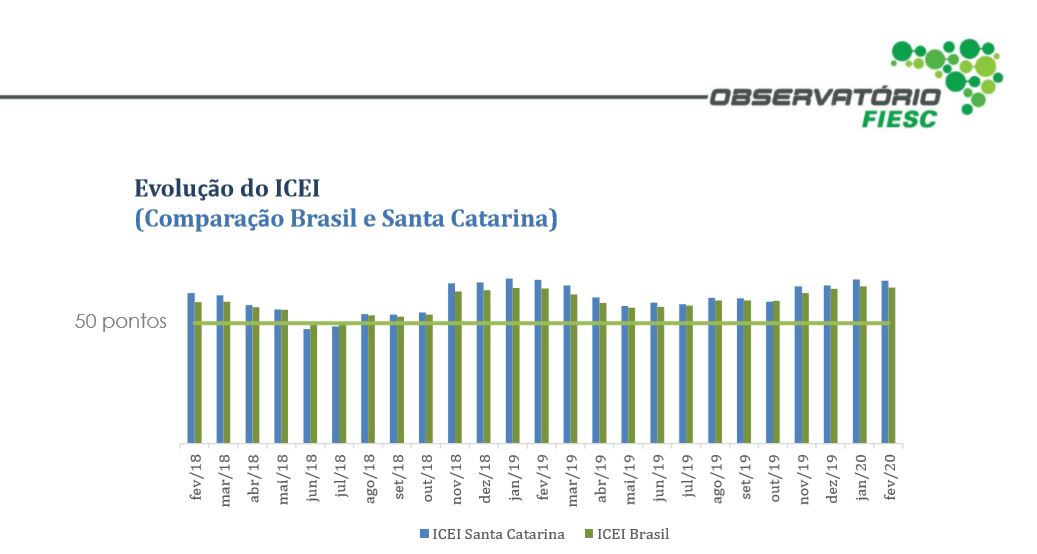 Florianópolis, 27.2.2020 – O Índice de Confiança do Empresário Industrial Catarinense (ICEI) alcançou 67,7 pontos em fevereiro. É o segundo melhor resultado para o mês dos últimos cinco anos e está acima da média nacional, que no mês foi 64,8 pontos, mostram os dados do Observatório FIESC, divulgados nesta quinta-feira (27). Os indicadores variam de zero a cem pontos. Quando estão acima de 50 pontos mostram que os empresários estão otimistas. Clique aqui e veja os dados completos