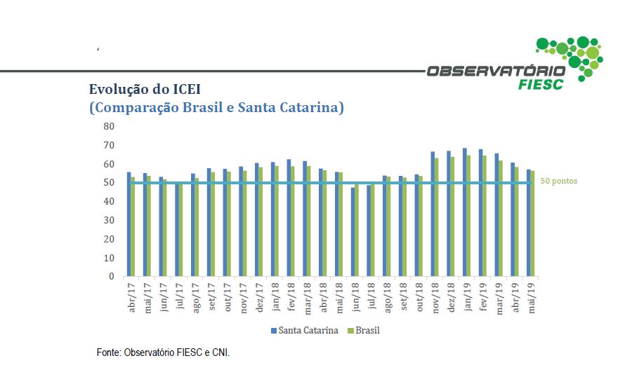 Florianópolis, 20.5.2019 – O Índice de Confiança do Empresário Industrial Catarinense (ICEI) registrou em maio a quarta queda consecutiva. O indicador passou de 60,8 pontos para 57,1 pontos. A redução foi puxada pela percepção dos empresários em relação à economia brasileira, informa pesquisa da Federação das Indústrias de Santa Catarina, divulgada nesta segunda-feira (20). Os indicadores variam de zero a cem pontos. Quando estão acima de 50 pontos mostram que os empresários estão otimistas. Veja aqui os dados completos