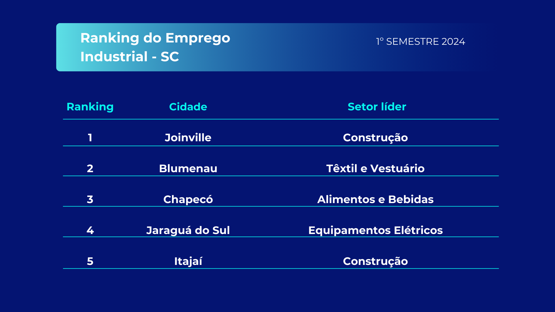 A cidade de Itajaí foi a quinta com maior saldo de vagas na indústria no primeiro semestre, com 1.935 empregos, com o desempenho puxado pela construção, que registrou 530 novas oportunidades. Na classificação geral, Itajaí ficou na segunda colocação, com a criação de 7.534 empregos.
