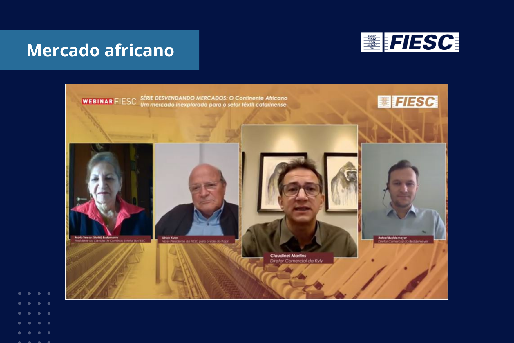 Florianópolis, 16.9.2020 – Em live promovida pela Câmara de Comércio Exterior da FIESC, representantes das empresas Kyly e Buddemeyer disseram que o design brasileiro é muito bem aceito em parte do mercado africano, especialmente em Angola. Além disso, é um continente que oferece oportunidades em nichos e a entrada nesse mercado pode ocorrer por meio de feiras, de um distribuidor ou da venda direta pela própria indústria. A transmissão foi realizada nesta quarta-feira, dia 16, pelo canal da FIESC no YouTube