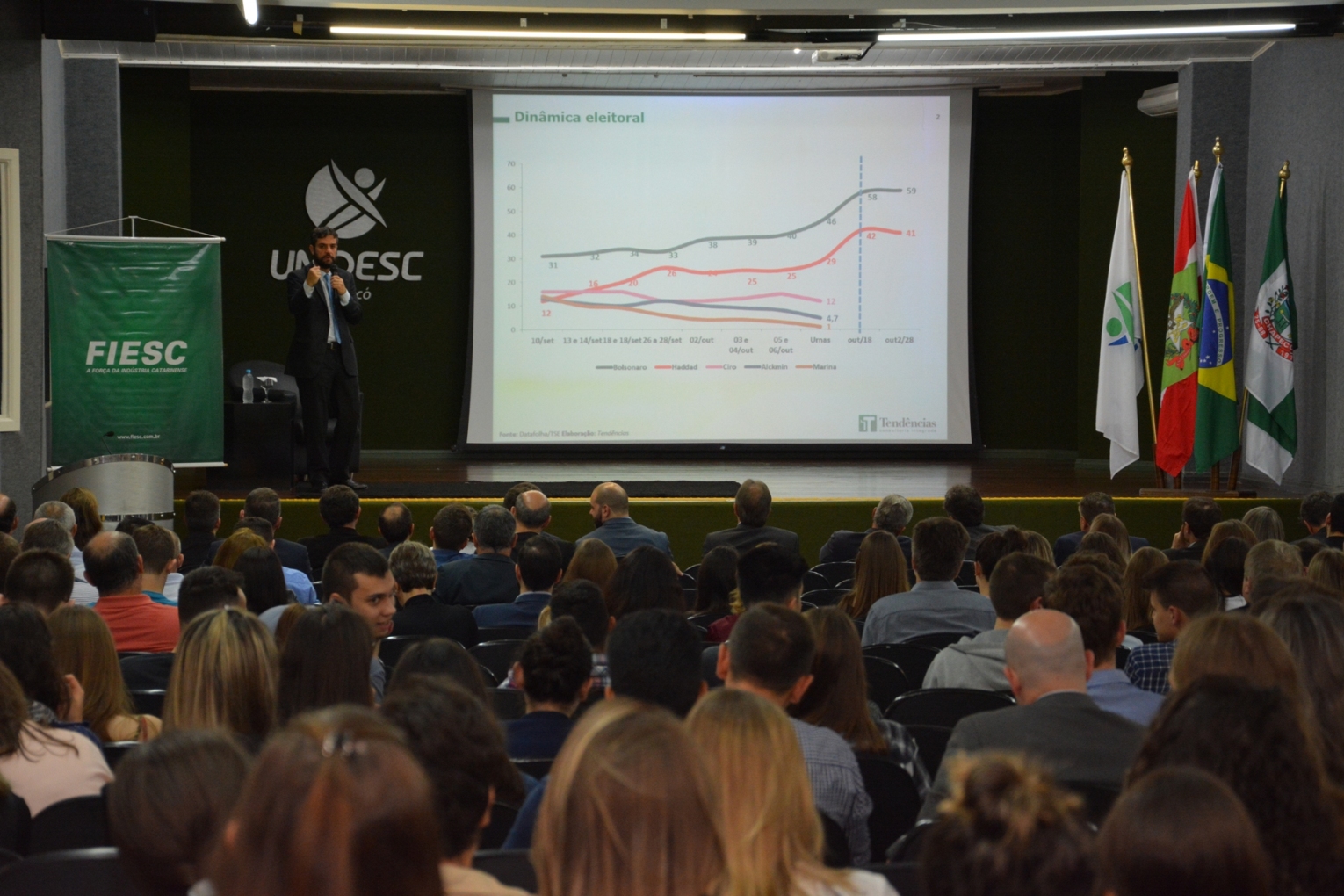 Chapecó, 26.10.2018 - Reconstruir a estabilidade econômica do Brasil é um dos desafios do próximo governo federal. O assunto foi analisado na noite desta quinta-feira (25), em Chapecó, pelo doutor em ciência política Rafael Cortez, que ministrou a palestra “O que vai ser do Brasil? Política e economia no próximo mandato”. A iniciativa foi promovida pela Federação das Indústrias de Santa Catarina (FIESC), com apoio da Unoesc Chapecó, e integrou a programação da gestão itinerante que a FIESC implementou nesta semana no Oeste.