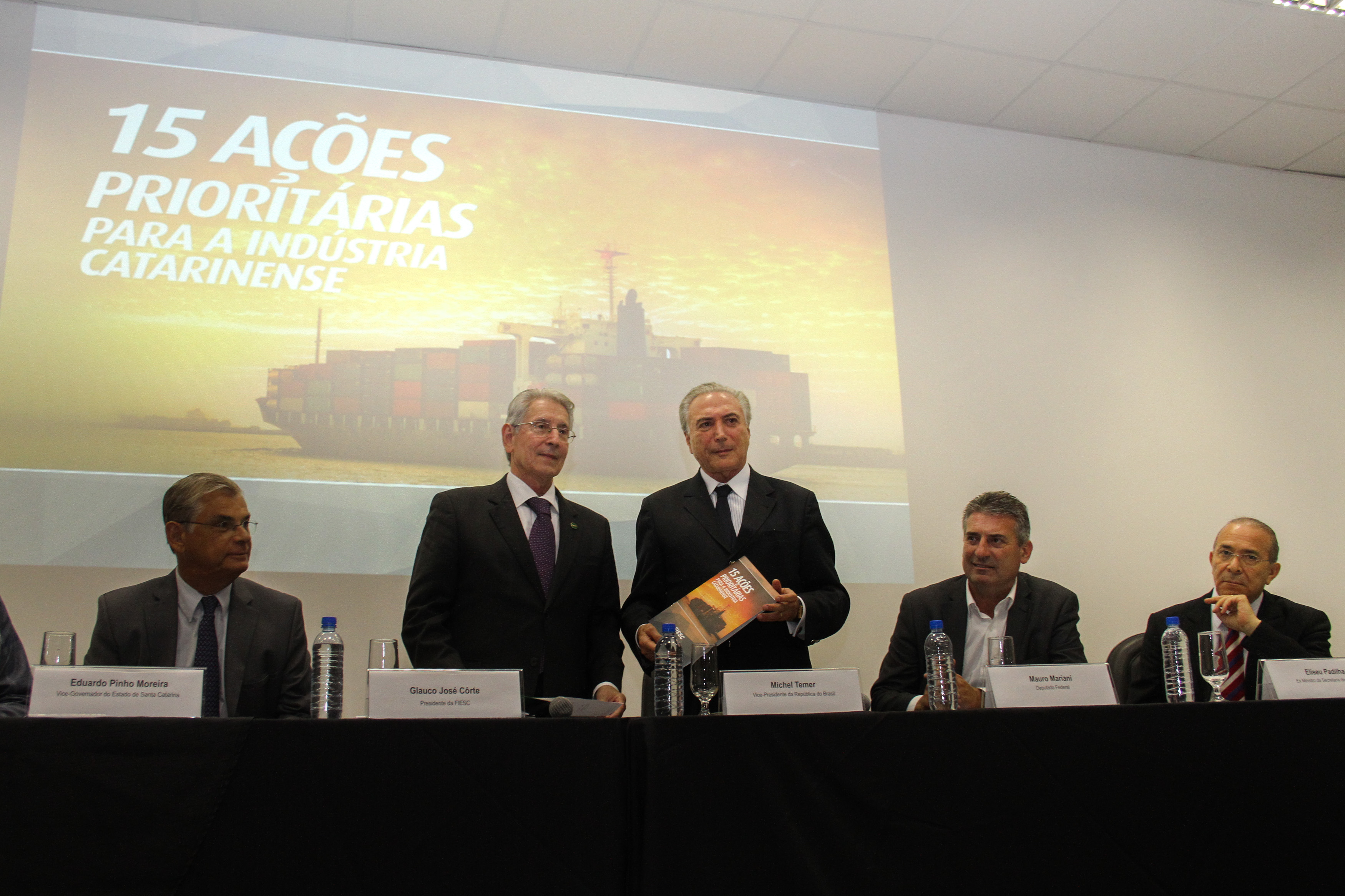 Em seu discurso, Côrte disse que os empresários de Santa Catarina decidiram por não chorar e não desistir. “Decidiram lutar por um País melhor, íntegro e desenvolvido do qual nós e nossos filhos possamos sempre nos orgulhar”, completou, após apresentar as 15 ações prioritárias da indústria catarinense contempladas em um documento entregue ao vice-presidente da República. São propostas nas áreas: política de desenvolvimento, ambiente institucional, produtividade, ajuste fiscal, política industrial, inovação, sistema tributário, inserção externa da indústria, relações trabalhistas e transporte e logística. Veja abaixo.