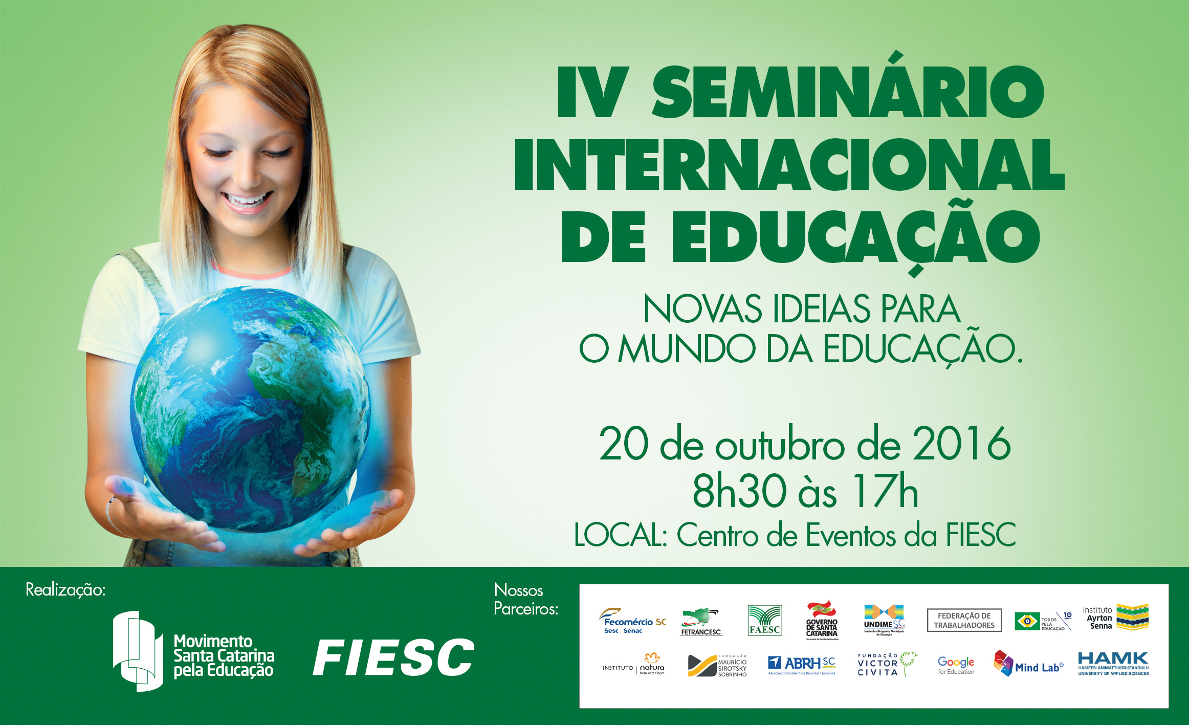 Florianópolis, 13.10.2016 – A Federação das Indústrias de Santa Catarina (FIESC) realiza nesta quinta-feira, dia 20, a quarta edição do Seminário Internacional de Educação com especialistas dos Estados Unidos, Chile e Colômbia. O evento, promovido por meio do Movimento Santa Catarina pela Educação, abordará neurociência e iniciativas da América Latina para elevar a qualidade dos sistemas educacionais.
