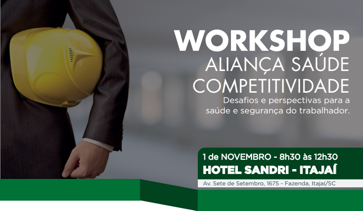 Florianópolis, 27.10.2016 – A FIESC, por meio do SESI e com o apoio do IEL, promove na próxima terça-feira (01) o workshop Aliança Saúde Competitividade, para discutir os desafios e perspectivas sobre a saúde e segurança do trabalhador. O encontro, que será realizado no Hotel Sandri, a partir das 8h30min, objetiva consolidar e priorizar as necessidades das indústrias relacionadas ao tema. A iniciativa é da Aliança Saúde Competitividade.