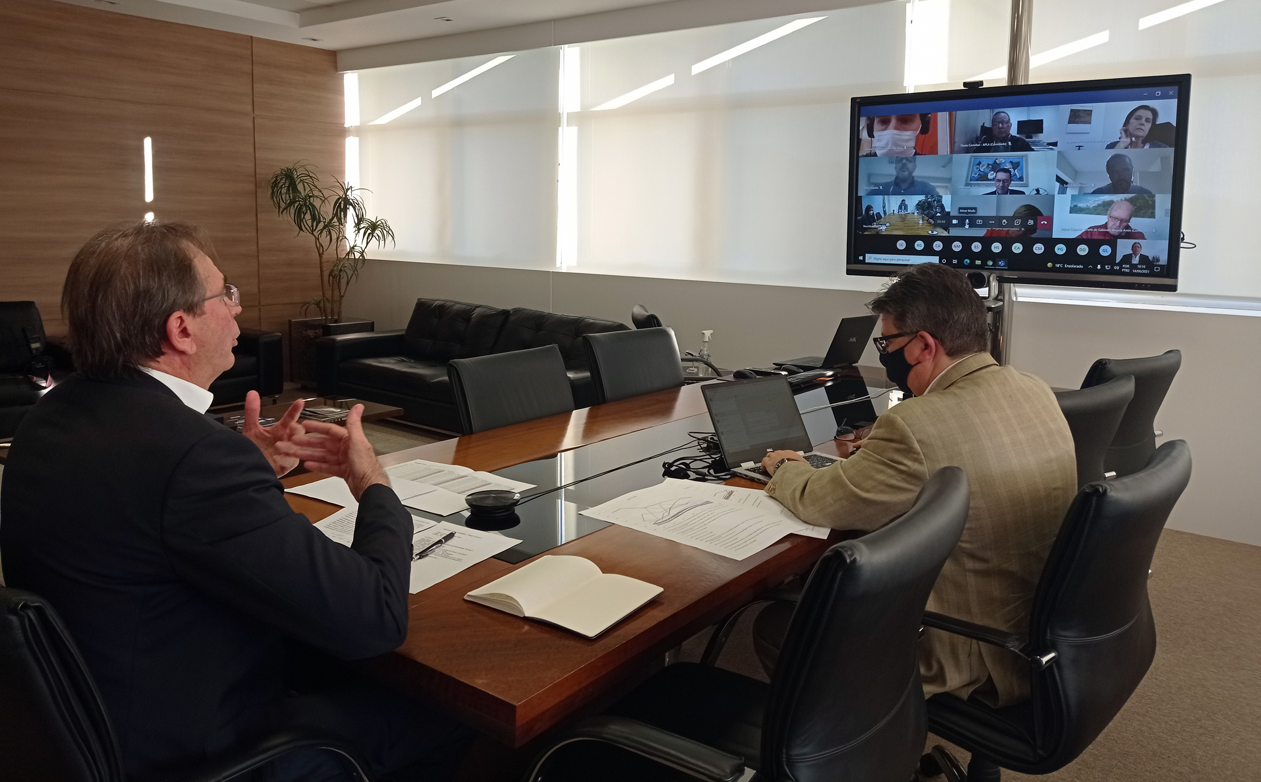 Florianópolis, 14.6.2021 - Em reunião com o secretário especial adjunto do Ministério da Economia, Bruno Portela, o presidente da Federação das Indústrias (FIESC), Mario Cezar de Aguiar, defendeu a redução temporária do imposto de importação do aço. O insumo teve alta superior a 100% em 12 meses e tem impactado diversos setores, principalmente a construção e o metalmecânico. A reunião virtual, realizada nesta segunda-feira, dia 14, foi intermediada pela coordenadora do Fórum Parlamentar, a deputada Angela Amin, e contou com a participação do deputado Vítor Lippi, de São Paulo, e de representantes da indústria deste estado.