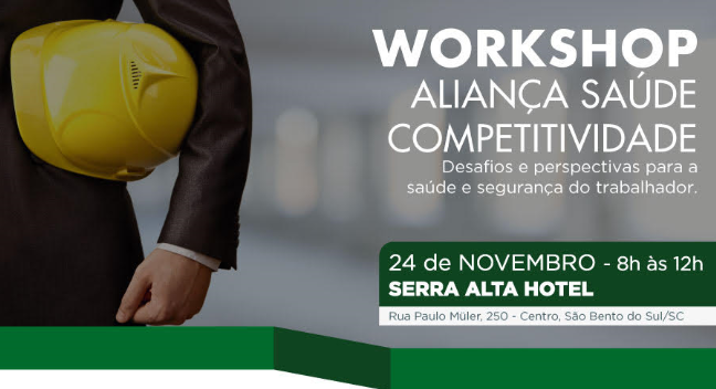 Florianópolis, 23.11.2016 – A FIESC, por meio do SESI e com o apoio do IEL, promove nesta quinta-feira (24), em São Bento do Sul, o workshop Aliança Saúde Competitividade, para discutir os desafios e perspectivas sobre a saúde e segurança do trabalhador. O encontro, que será realizado no Serra Alta Hotel, a partir das 8 horas, objetiva consolidar e priorizar as necessidades das indústrias relacionadas ao tema. A iniciativa é da Aliança Saúde Competitividade.