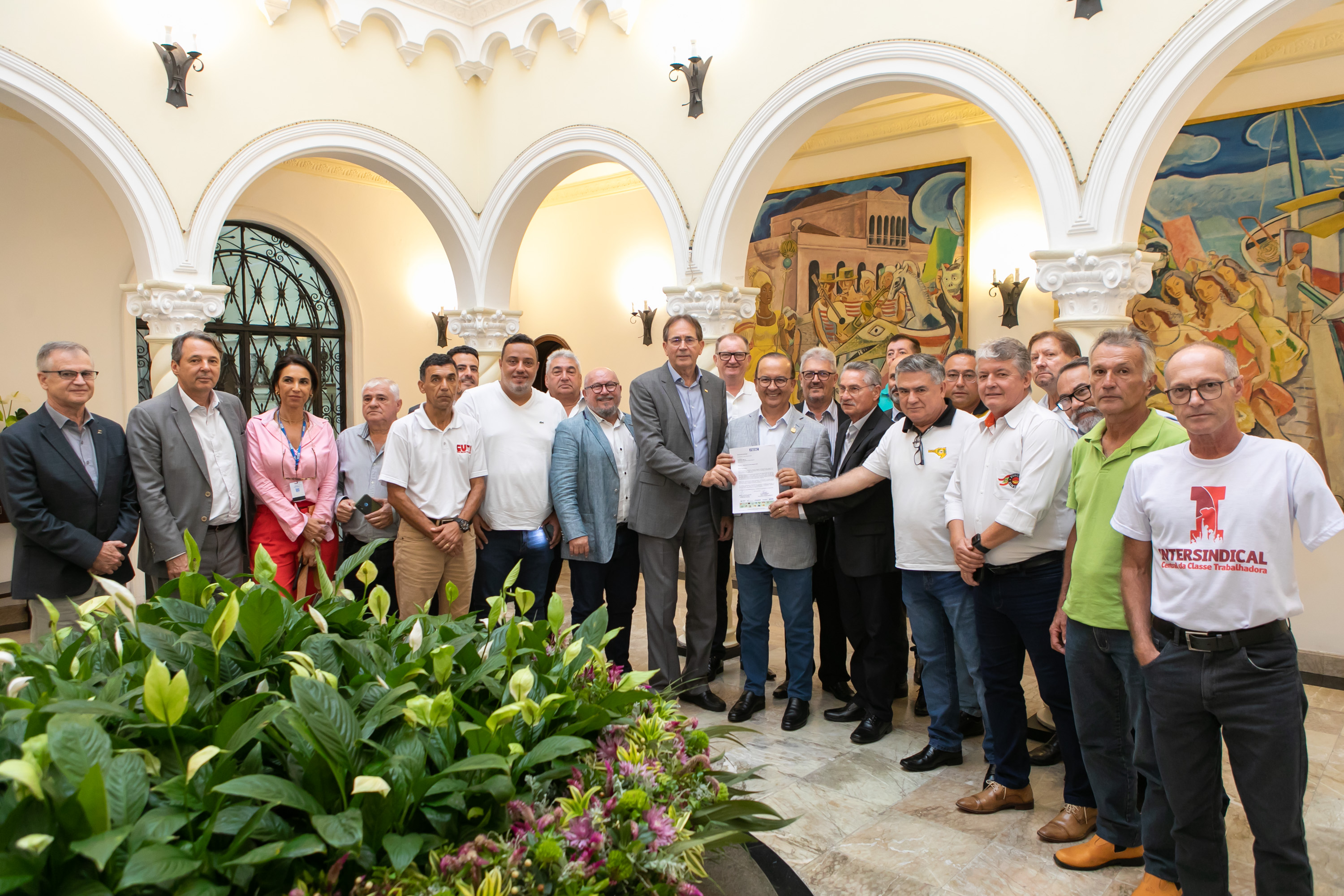 Florianópolis, 10.3.2023 – Representantes das federações empresariais, das centrais sindicais e das federações de trabalhadores de Santa Catarina entregaram ao governador do estado, Jorginho Mello, a proposta de consenso de atualização do mínimo regional para 2023. A reunião foi realizada na Casa d'Agronômica, em Florianópolis, nesta sexta-feira, dia 10. A proposta será transformada em projeto de lei e encaminhada à Assembleia Legislativa para aprovação. As novas faixas terão valores de R$ 1.521, R$ 1.576, R$ 1.669 e R$ 1.740 e o aumento médio é de 7,43% nas quatro faixas.