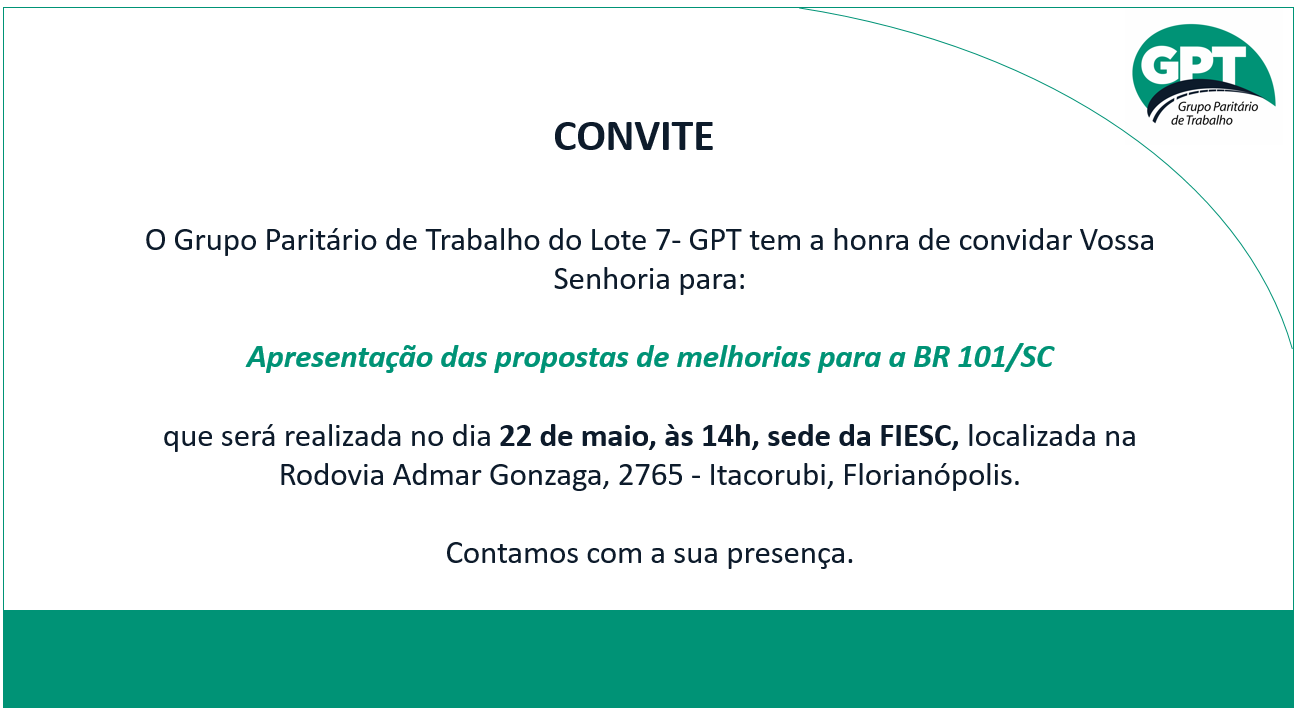Florianópolis, 19.5.2017 – O Grupo Paritário do Lote 7 (GPT) da BR-101 Norte apresentará à Agência Nacional de Transportes Terrestres (ANTT) e ao Fórum Parlamentar Catarinense propostas de investimentos no trecho catarinense da rodovia, durante reunião na segunda-feira, dia 22 de maio, às 14 horas, na Federação das Indústrias de Santa Catarina (FIESC), em Florianópolis. O encontro terá a participação de David Diaz, presidente da Arteris, Paulo Castro, diretor superintendente da Autopista Litoral Sul, e Marcelo Módolo, superintendente de infraestrutura do contorno rodoviário de Florianópolis.
