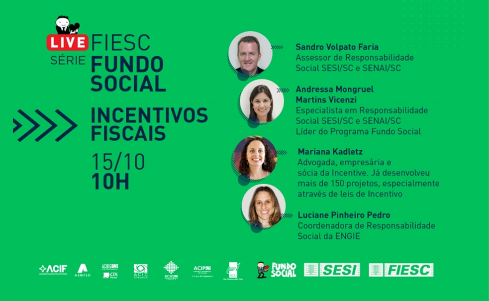 Florianópolis, 13.10.2020 – A Federação das Indústrias (FIESC) dá início nesta quinta-feira (15) a uma série de encontros on-line gratuitos para oportunizar que empresas e o terceiro setor, como organizações da sociedade civil, promotores culturais e proponentes de projetos, capacitem-se em relação aos mecanismos de incentivo fiscal para que mais recursos fiquem em Santa Catarina, por meio do redirecionamento do imposto de renda. Os encontros integram cronograma de ações do Programa Fundo Social, iniciativa que a Federação conduz desde 2017 e tem como foco impulsionar o uso dos incentivos fiscais no estado. Sempre às 10 horas, as seis lives serão transmitidas pelo canal do SESI no YouTube.