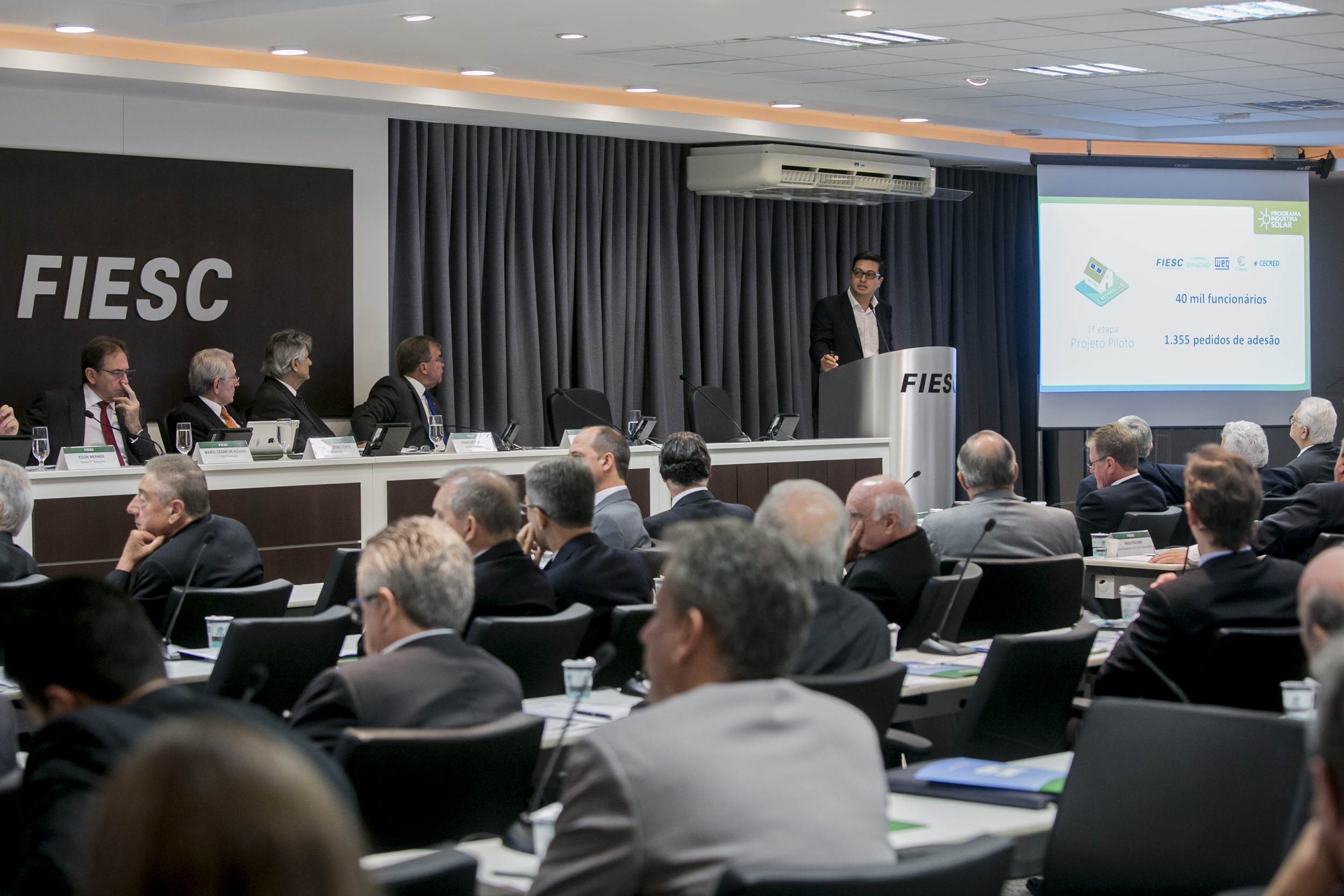 Florianópolis, 23.2.2018 – A segunda etapa do Programa Indústria Solar, com foco nas pequenas e médias indústrias catarinenses, foi lançada nesta sexta-feira (23), durante reunião de diretoria da Federação das Indústrias de Santa Catarina (FIESC). A iniciativa é da FIESC e das empresas ENGIE e WEG, que fornecem e instalam os sistemas, com o apoio da Centrais Elétricas de Santa Catarina (CELESC) e das instituições financeiras Banco Regional de Desenvolvimento do Extremo Sul (BRDE) e Cooperativa Central de Crédito Urbano (CECRED). As inscrições devem ser feitas no site www.programaindustriasolar.com.br.