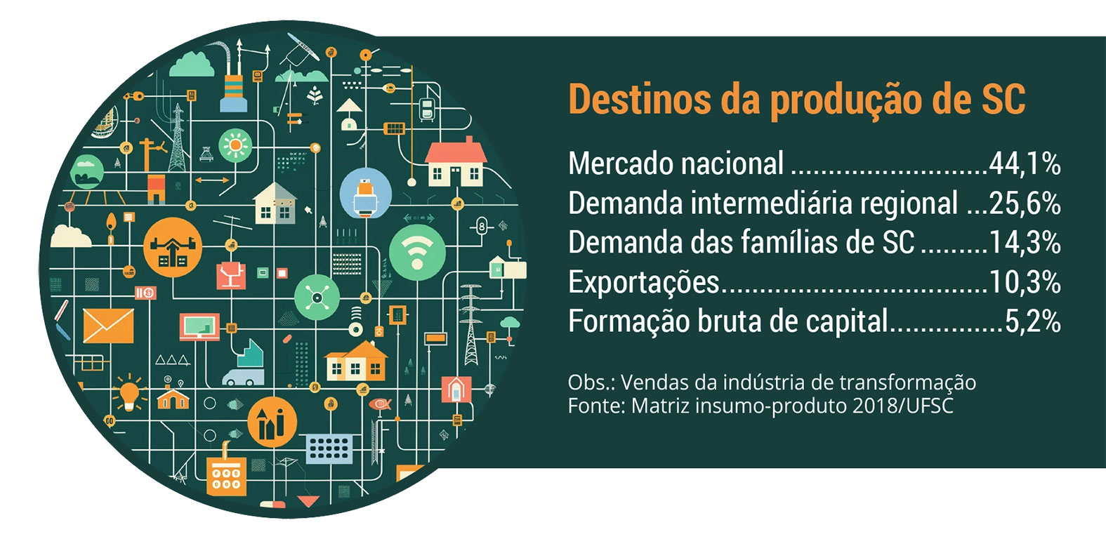 O estudo analisou as origens dos insumos e os destinos da produção industrial (matriz insumo-produto). Dentre os achados ficou demonstrado que, considerando a origem dos insumos industriais, há elevados níveis de integração local da produção nos principais setores. Isso quer dizer que Santa Catarina é capaz de suprir grande parte de suas necessidades localmente. Em setores como alimentos e bebidas, 69% dos insumos são adquiridos dentro do Estado. Setores de madeira e confecções também se destacam (veja o quadro abaixo). “Essa capacidade de internalizar etapas da produção diminui os custos logísticos e as vulnerabilidades diante de flutuações no mercado global”, afirma Pablo Bittencourt, economista-chefe da FIESC, professor da UFSC e um dos autores do estudo.