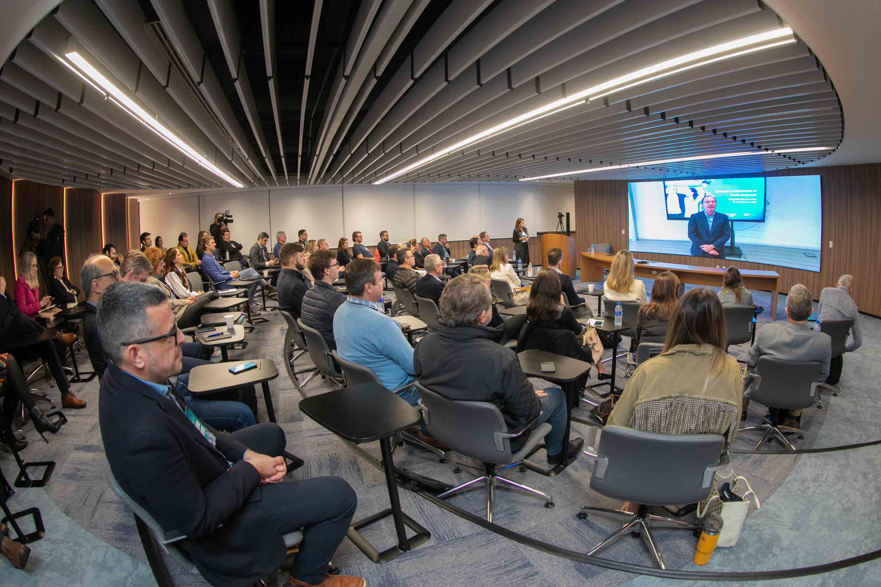 Alexandre Dias da Cunha, da Nova School of Business and Economics, de Lisboa, ministrou a primeira aula do programa executivo da Federação que visa formar sucessores nos negócios; executivos que participam da formação reúnem-se no novo ambiente, localizado na sede da FIESC, em Florianópolis