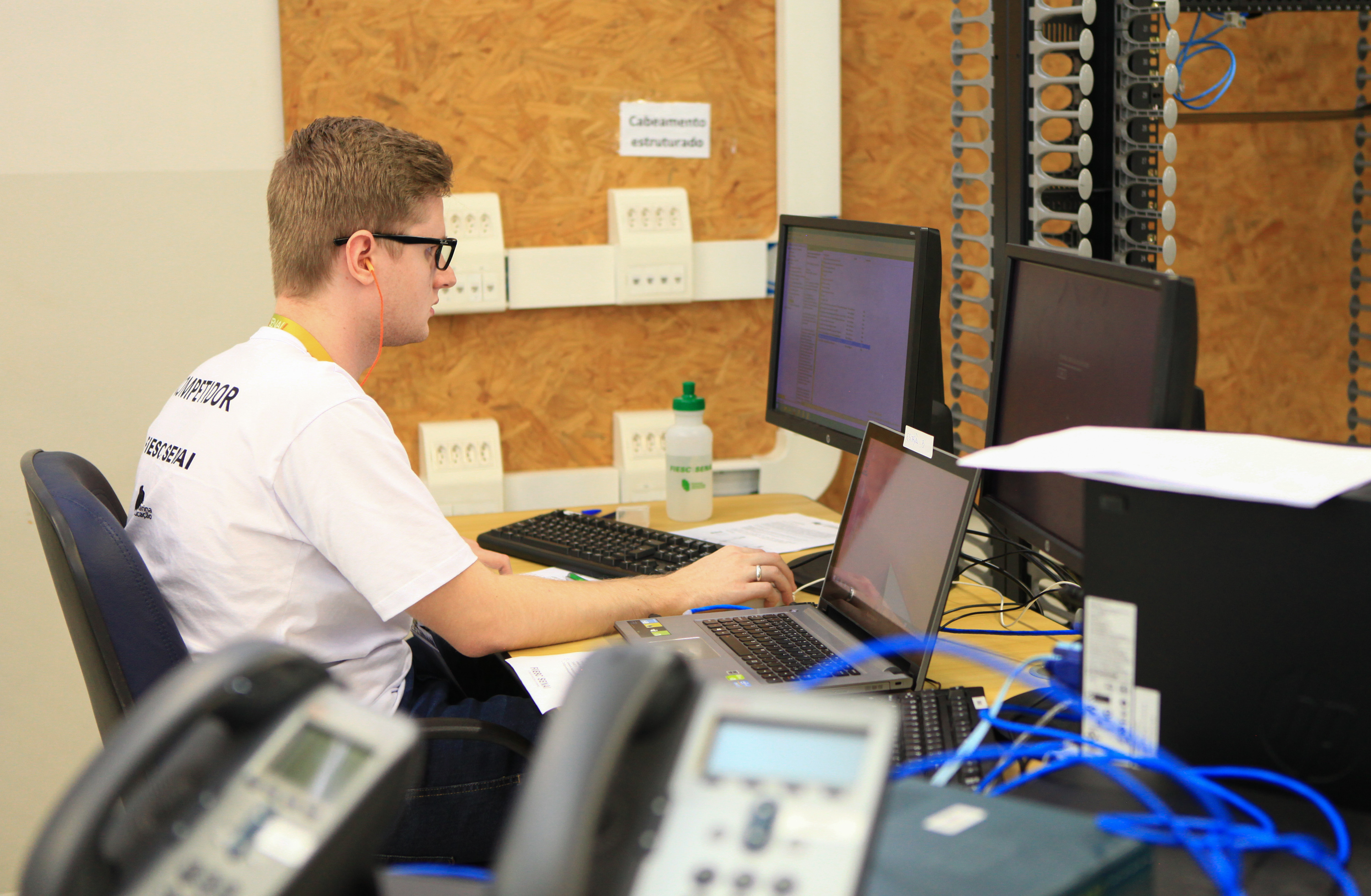 Eduardo e outros dois colegas disputam uma vaga na etapa nacional do torneio e precisam configurar nesta quarta-feira os servidores Windows de uma grande corporação atendendo a critérios técnicos e prevendo o maior número de soluções para situações reais da indústria. “Como competidor, temos que lidar com diversos aspectos. Estudamos muitas condições que podem ser encontradas nas provas, os projetos sofrem alteração e retratam o que enfrentamos no mercado”, comenta o estudante. Na terça, a prova exigia a configuração de servidores Linux.