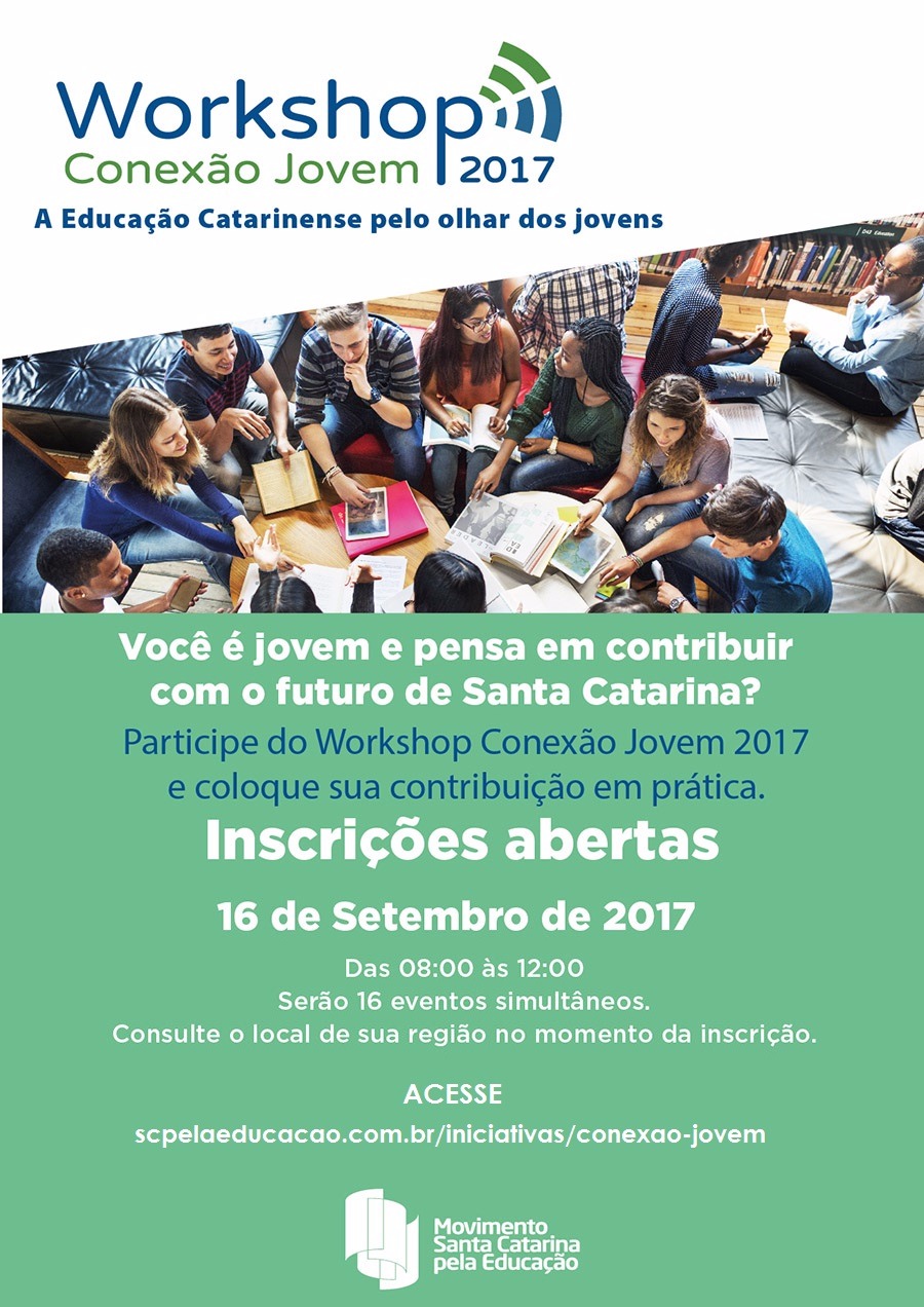 Florianópolis, 14.8.2017 – Cerca de 3,2 mil jovens participarão no dia 16 de setembro do workshop Conexão Jovem 2017 promovido pelo Movimento SC pela Educação. O objetivo é promover o diálogo entre os jovens catarinenses sobre o tema, com foco na escolaridade, vantagens de permanecer na escola e demais melhorias na educação. Serão 16 encontros simultâneos, realizados nas cidades-sede das vice-presidências da Federação das Indústrias de Santa Catarina (FIESC), organizados pelos jovens embaixadores do Movimento com o apoio de voluntários.