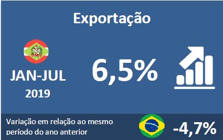 Florianópolis, 6.8.2019 – As exportações catarinenses de janeiro a julho somaram US$ 5,29 bilhões. O valor é 6,5% superior ao registrado no mesmo período do ano passado, mostram os dados do Ministério da Economia divulgados pela FIESC, nesta terça-feira (6). O desempenho foi puxado pela ampliação dos embarques de carne de aves, que cresceram 34,3% e é o principal produto da pauta, e carne suína, com alta 36,3%, o segundo produto mais exportado pelo estado. Os embarques de soja diminuíram -18,7%, de partes para motor recuaram -2,4% e motores elétricos registraram decréscimo de -2,5%. Veja aqui os dados completos