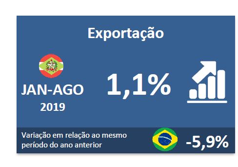 Queda em agosto: No mês de agosto, os embarques catarinenses somaram US$ 692,78 milhões. O valor é 29,1% inferior ao registrado no mesmo mês de 2018. O desempenho negativo foi puxado principalmente pelo recuo dos embarques de carnes de aves, que caíram 33%, e de soja, que diminuiu 74%.