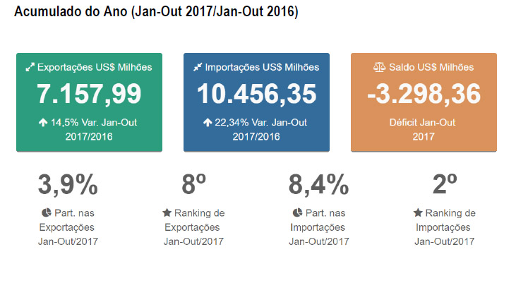 Ainda no período de janeiro a outubro, as importações do Estado cresceram 22,3% em relação ao mesmo período do ano anterior, alcançando US$ 10,456 bilhões. O resultado, embora acima do observado em 2016, está abaixo da média dos últimos sete anos. Ainda assim, o desempenho dá a Santa Catarina o segundo lugar no ranking de importações, respondendo por 8,4% das compras vindas do exterior.