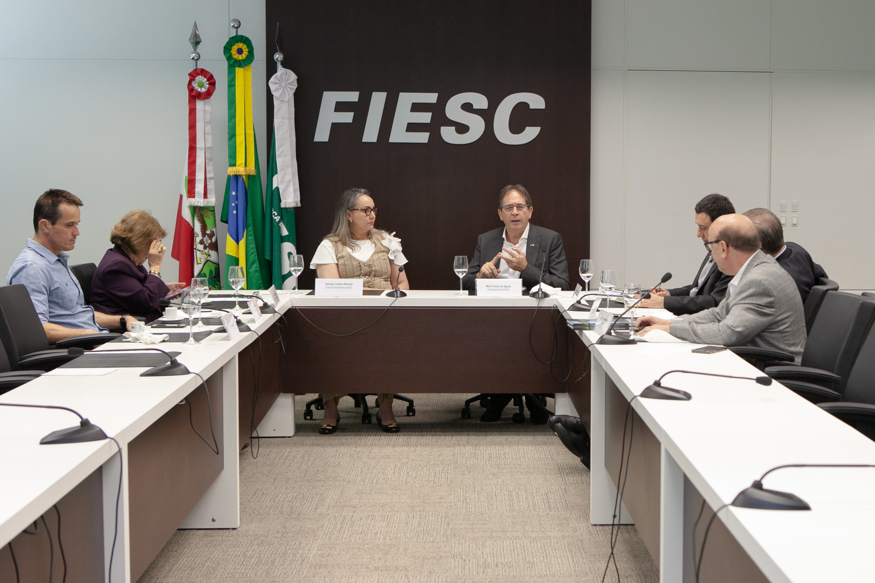 Florianópolis, 10.10.2019 – O presidente da FIESC, Mario Cezar de Aguiar, debateu com a vice-governadora, Daniela Cristina Reinehr, a proposta da entidade para o modal ferroviário do estado. No encontro, realizado nesta quinta-feira (10), em Florianópolis, com a participação de executivos da entidade, ele informou que esteve no Ministério da Justiça, ontem, buscando uma solução conciliatória para a questão indígena no Morro dos Cavalos, que hoje impede a conclusão total do trecho sul da BR-101 e do projeto da Ferrovia Litorânea