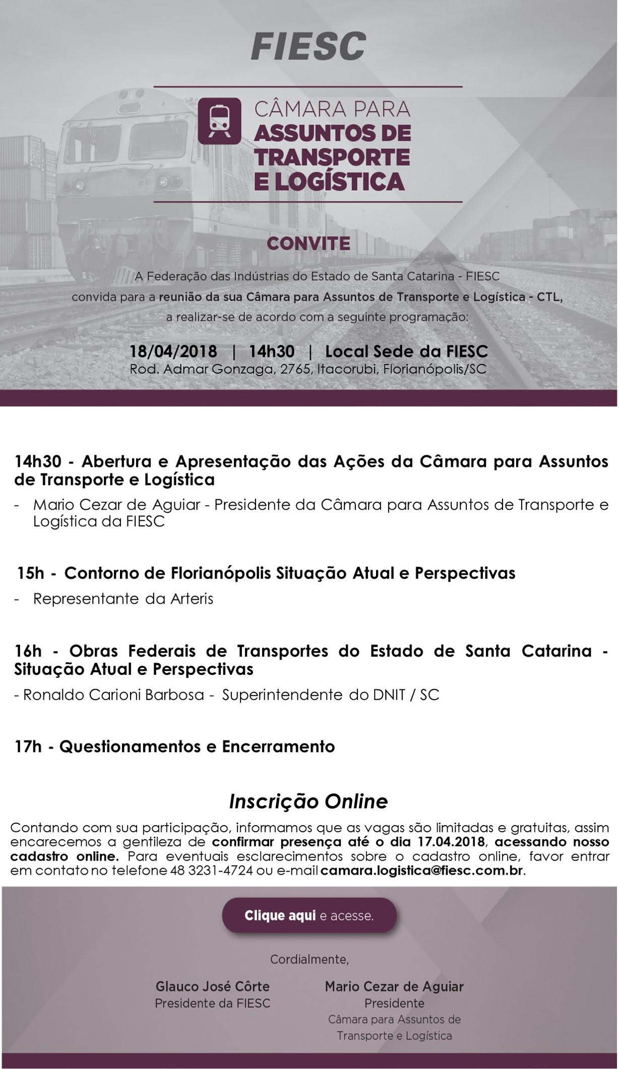 Florianópolis, 16.4.2018 – A Federação das Indústrias de Santa Catarina (FIESC) recebe na quarta-feira (18) representante da Arteris para falar sobre as perspectivas da obra do contorno viário da Grande Florianópolis. O assunto será abordado na reunião da Câmara de Transporte e Logística da entidade, a partir das 14h30. O superintendente do DNIT, Ronaldo Barbosa, também participa do encontro para informar sobre a situação das obras federais de transporte. Os interessados em participar devem se inscrever aqui.