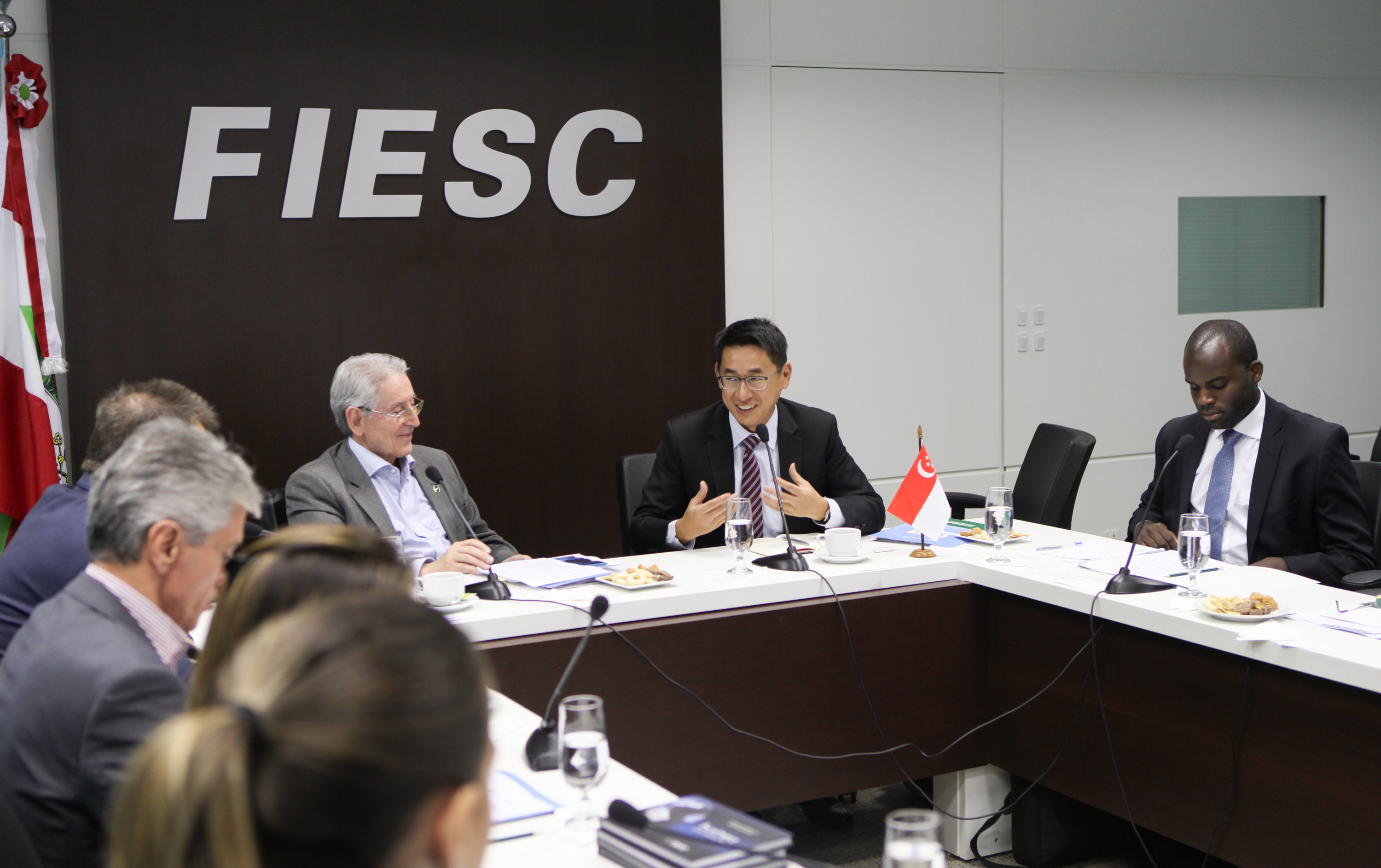 Florianópolis, 25.5.2017 – Uma comitiva de executivos de Cingapura participou nesta quinta-feira (25) de encontro na Federação das Indústrias de Santa Catarina (FIESC) para avaliar oportunidades de negócios e parcerias, especialmente no setor portuário. Eles foram recebidos pelo presidente da FIESC, Glauco José Côrte, que destacou números da indústria catarinense e colocou à disposição a Investe SC, agência de atração de investimentos mantida por meio de parceria entre a entidade e o governo do Estado. A visita é desdobramento da missão catarinense realizada recentemente a Cingapura.