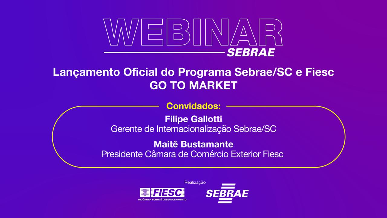 Florianópolis, 11.05.2020 – A Federação das Indústrias e o Sebrae de Santa Catarina realizam na terça-feira (12), às 19 horas, um webinar para lançar o programa Go To Market que vai oferecer capacitações, consultorias especializadas e qualificação competitiva para as empresas catarinenses. O objetivo é fortalecer a corrente internacional, seja na importação ou exportação, e desenvolver a competitividade das micro e pequenas empresas de forma sustentável, aumentando a rentabilidade.