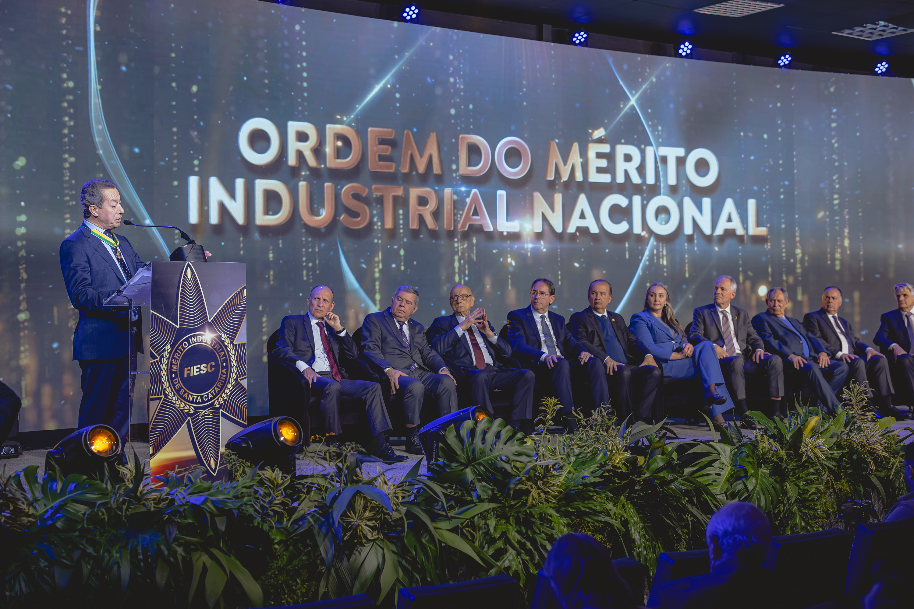 Florianópolis, 27.06.25 - A Federação das Indústrias de Santa Catarina (FIESC) realizou nesta sexta-feira (27), a cerimônia de entrega da Ordem do Mérito Industrial de Santa Catarina para os empresários: Claudimar Bortolin, diretor da Torfresma Industrial; Gunter Knolseisen, fundador da Automatic Electric; Mirian Maria Bonissoni Giombelli Canfield, diretora-presidente do Grupo Ipumirim; Roberto Zagonel, CEO da Zagonel, e Viviane Cecilia Lunelli, presidente da Lunelli. Na ocasião, o presidente da Aurora Coop, Neivor Canton, recebeu a Ordem do Mérito Industrial da CNI, a comenda máxima da indústria nacional.