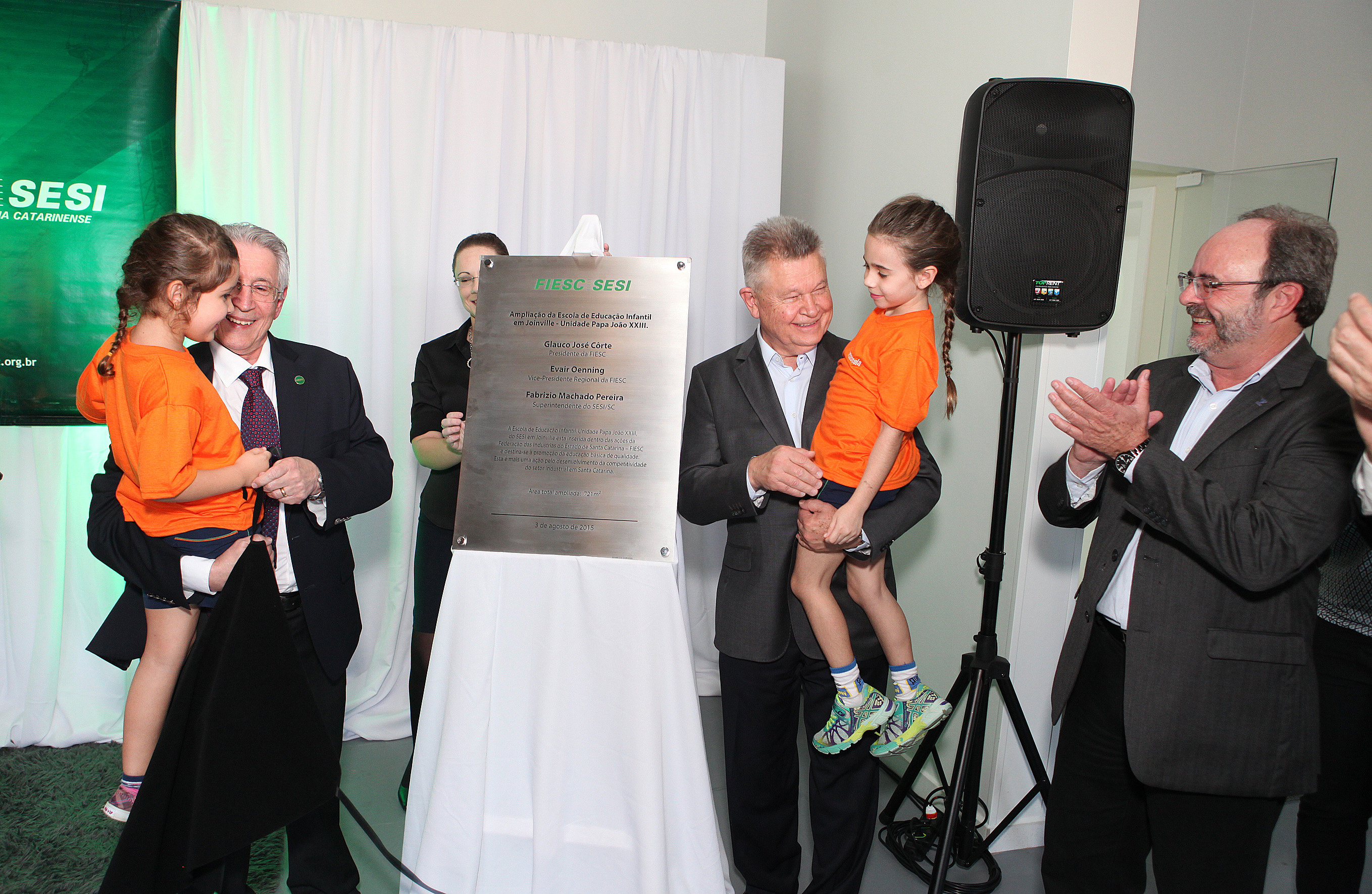 Joinville, 3.8.2015 – A Federação das Indústrias de Santa Catarina (FIESC) entregou nesta segunda-feira (3) a revitalização da unidade Papa João XXIII do SESI Escola Educação Infantil, em Joinville. Localizada no Bairro Iririú, a escola atende 215 crianças, de 0 a 6 anos, filhos de trabalhadores de 71 indústrias. São dez salas de atividades, duas salas de repouso, sala de informática, solário, sala de professores, refeitório, horta e parque infantil. Além de melhorias de climatização, foram revitalizados o parque externo, ampliadas as calçadas e o estacionamento, e instalado um campo de futebol de areia.