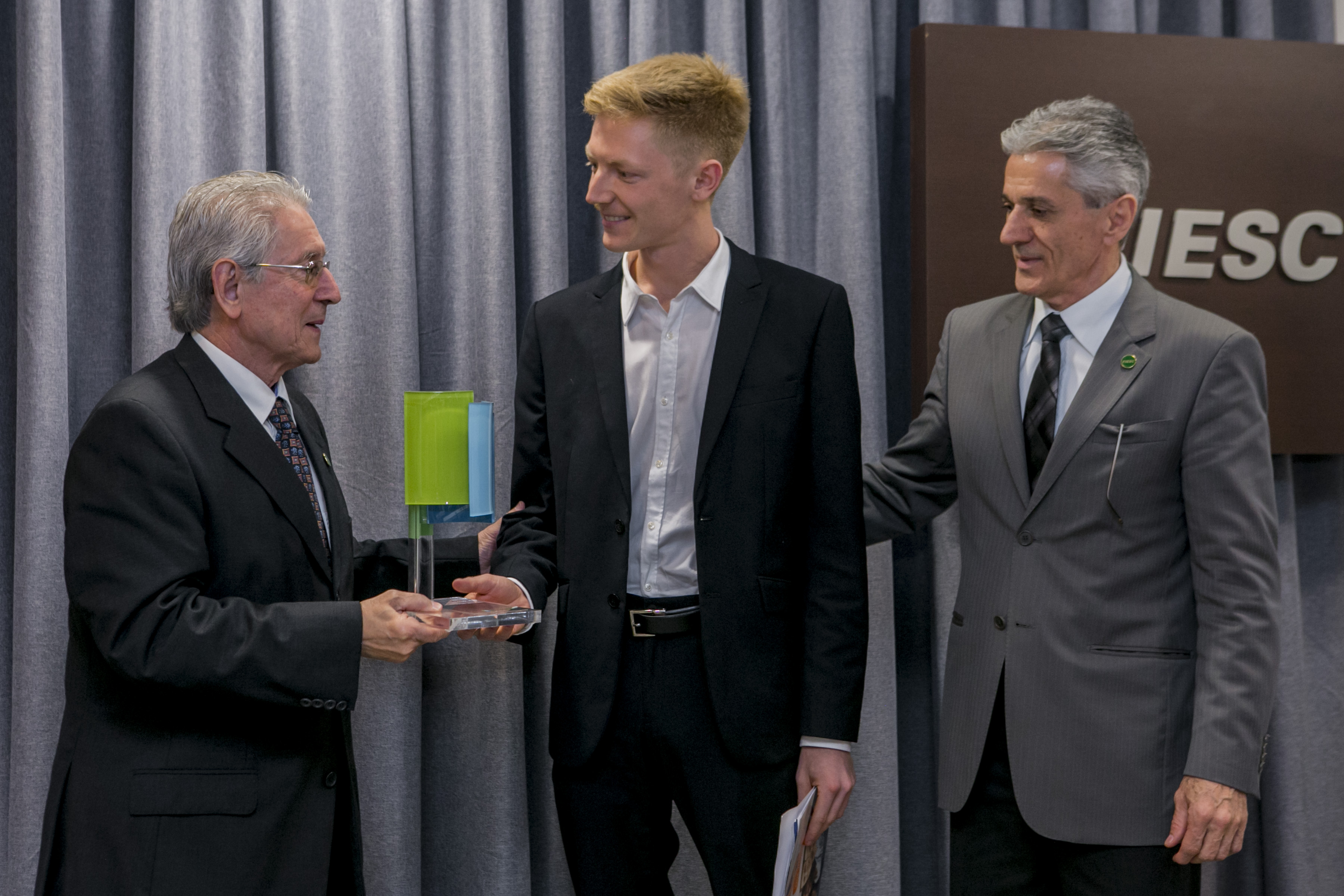 Florianópolis, 19.8.2016 – A Federação das Indústrias de Santa Catarina (FIESC) homenageou nesta sexta-feira, dia 19, o jovem Tom Claudino dos Santos, um dos vencedores do concurso de redação promovido pela Organização das Nações Unidas (ONU) sobre cidadania global, entendimento cultural e o papel que habilidades multilíngues podem desempenhar na promoção destes. Ele recebeu o troféu Movimento Santa Catarina pela Educação das mãos do presidente da FIESC, Glauco José Côrte, e do assessor do Movimento, Antônio José Carradore. Além dessa homenagem, a reunião de diretoria da entidade contou com a assinatura de convênios na área da educação para ampliar as ações do Movimento Santa Catarina pela Educação e a oferta de qualificação profissional.