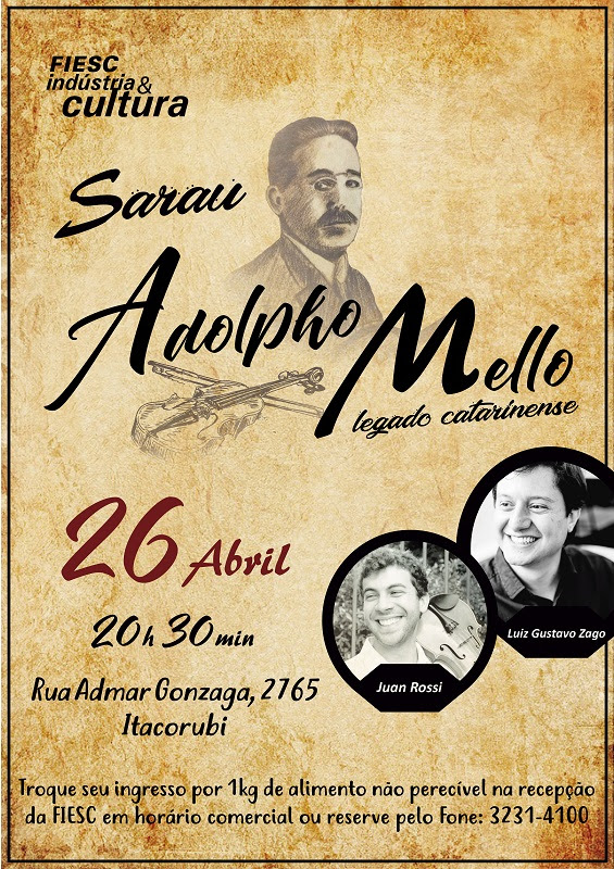 Florianópolis, 17.4.2018 – O Projeto FIESC Indústria e Cultura apresenta no próximo dia 26 de abril, às 20h30, o Sarau Adolpho Mello, legado catarinense. As reservas para assistir ao espetáculo podem ser feitas na recepção da FIESC (Rodovia Admar Gonzaga, 2765, Itacorubi) ou pelo telefone 3231 4100. A entrada é gratuita, mediante a doação de 1 kg de alimento não perecível.