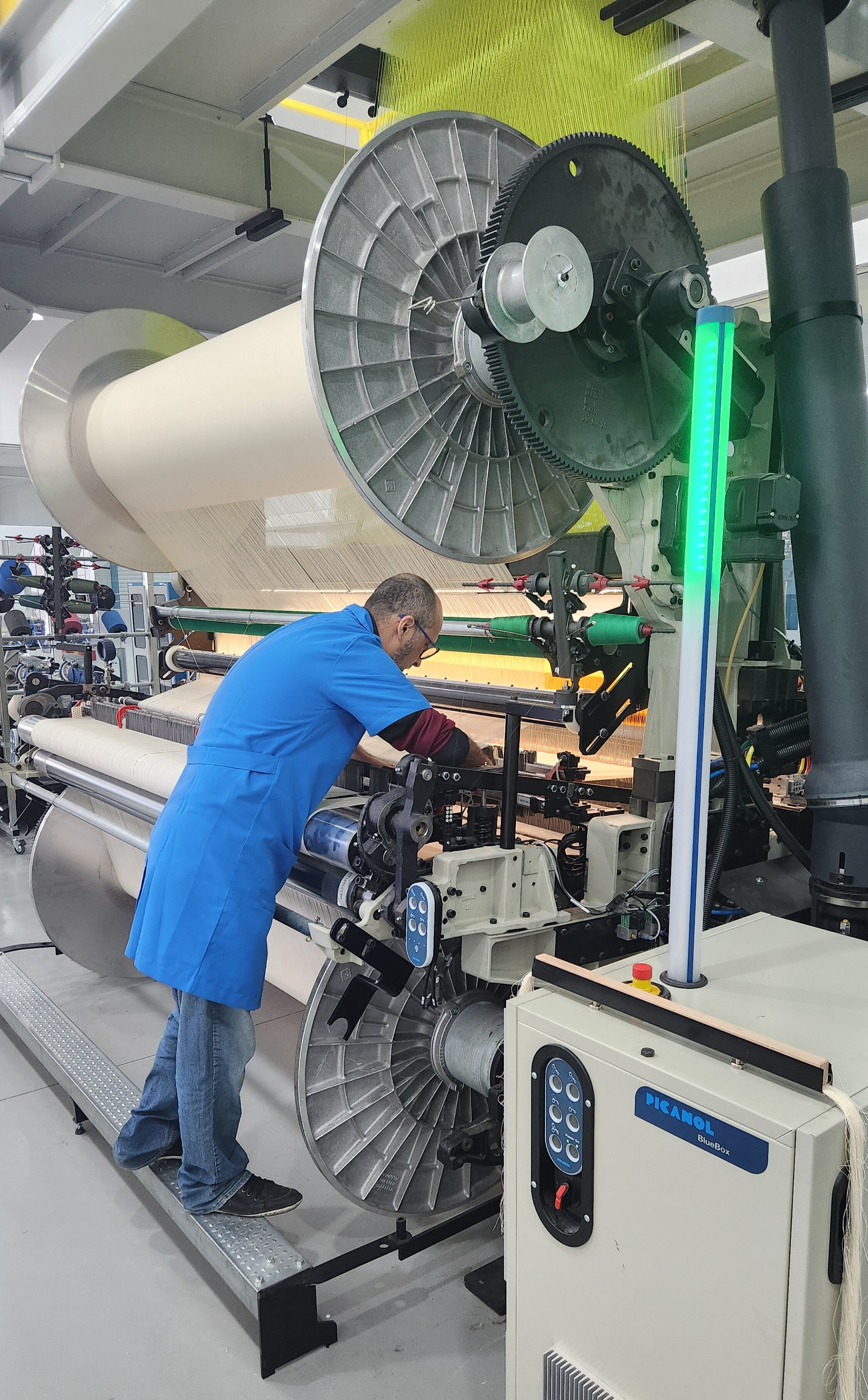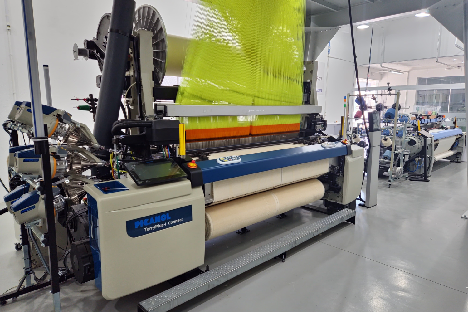 O maquinário é programado automaticamente com o uso de software CAD/CAM, coneTearctado em rede, que digitaliza o design têxtil e comanda os teares na produção. Ou seja, o equipamento está conectado a uma rede online permitindo a comunicação entre o software e as máquinas. Isso facilita a transferência de designs digitais para os teares, permitindo uma produção mais rápida e precisa.