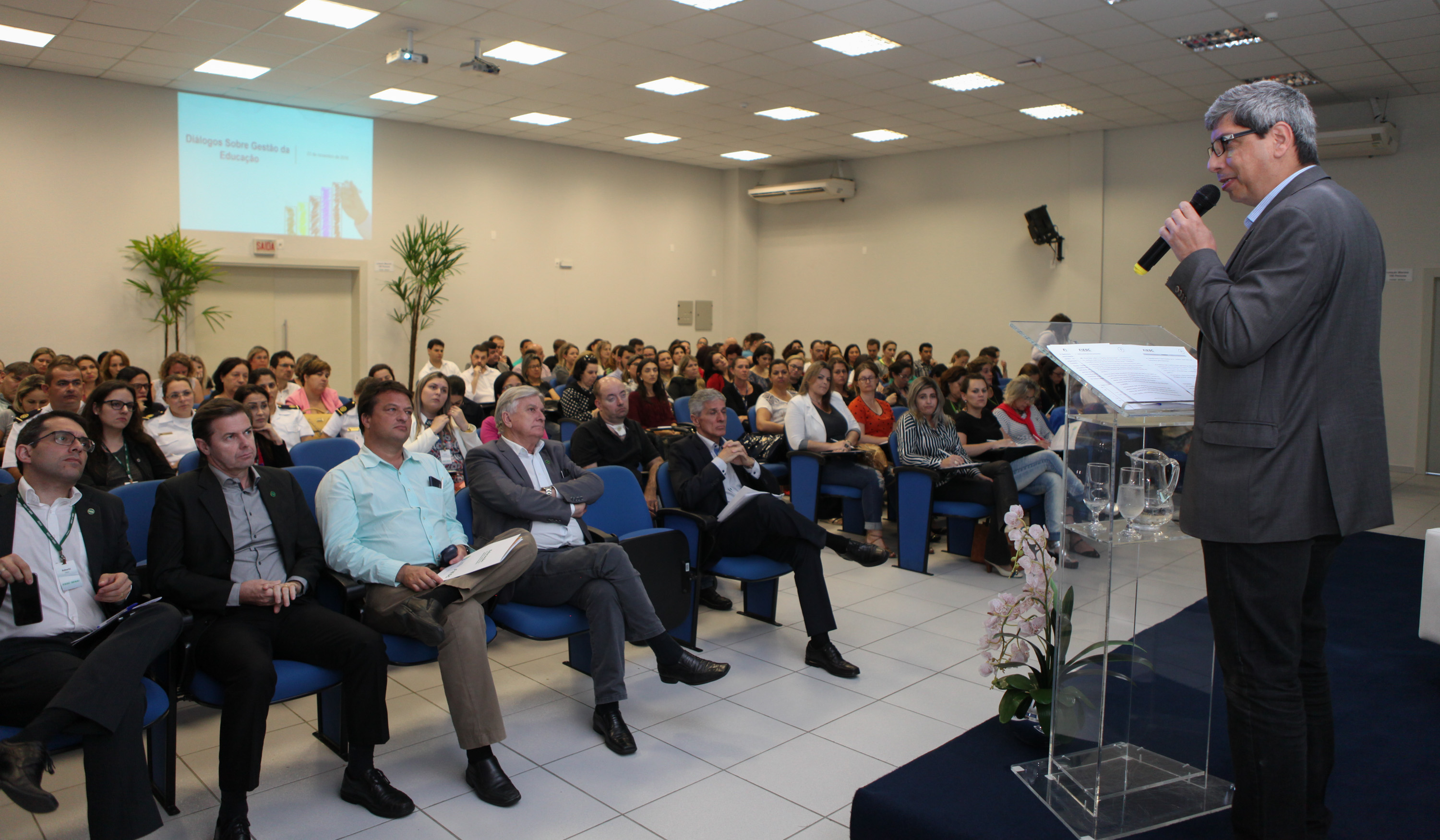 São José, 23.11.2016 – O resultado educacional das escolas depende de uma gestão organizada. Se a escola precisa oferecer formação integral do indivíduo, deve estar organizada para isso. A afirmação é do diretor institucional do Conselho Nacional de Secretários de Educação (Consed), Antônio Paiva Neto, que nesta quarta-feira (23), conduziu os debates do seminário Diálogos sobre Gestão da Educação. Este é o último encontro da série realizada pela FIESC por meio do Movimento Santa Catarina pela Educação, que reuniu em todo o Estado mais de 4 mil pessoas nos debates sobre o tema. Na Grande Florianópolis, o evento contou com a participação de educadores e gestores municipais da região.