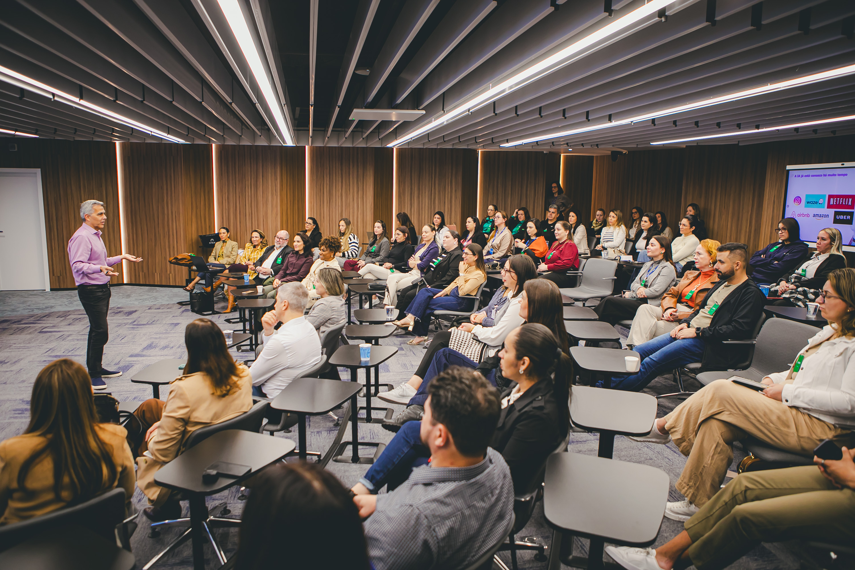 Os participantes acompanharam palestra com Marcelo Nóbrega, especialista em inovação e tecnologia aplicadas à gestão de pessoas, sobre Liderança Inteligente: Inovação e IA a Serviço das Pessoas.