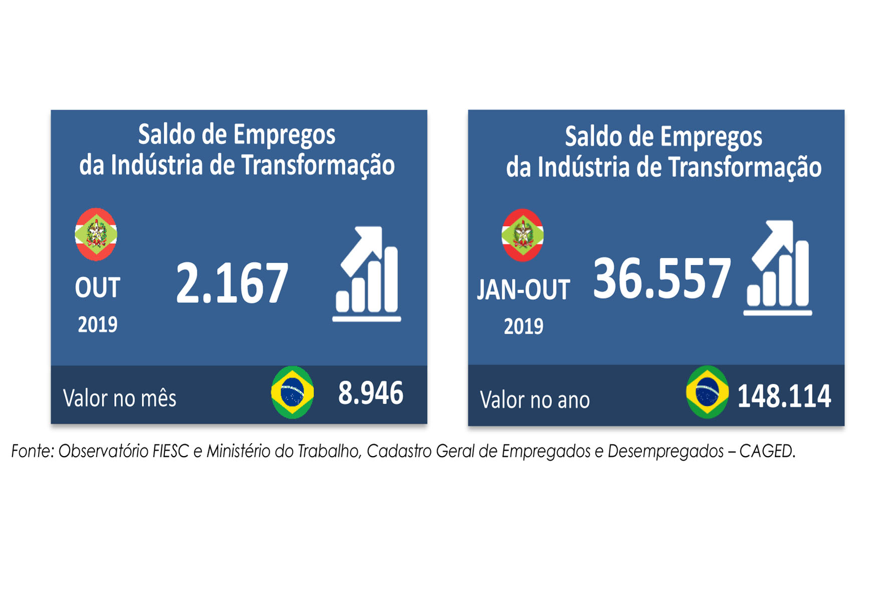 O mercado de trabalho de SC registrou a abertura de 11.579 vagas com carteira assinada em outubro de 2019. Esse desempenho foi o 3º melhor do Brasil no mês e no acumulado do ano, com 85.018 novos postos de trabalho.