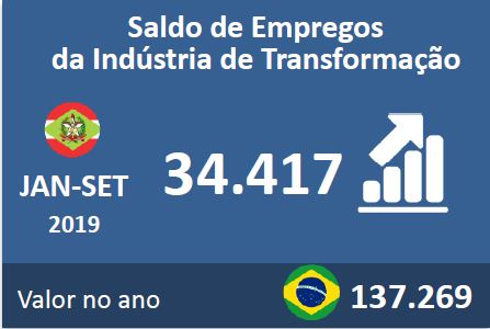 Florianópolis, 16.10.2019 – De janeiro a setembro, a indústria de transformação de Santa Catarina gerou 34,4 mil empregos, o melhor desempenho desde 2013. Os dados são do Ministério da Economia e foram divulgados pelo Observatório FIESC, nesta sexta-feira (18). Os segmentos que puxaram o desempenho positivo foram o têxtil e vestuário, que no período abriu 8,3 mil vagas, alimentos e bebidas e químico e produtos farmacêuticos se destacaram como o segundo e terceiro setores que mais geraram vagas no ano, com 8,1 mil e 3,1 mil novos postos, respectivamente. Veja aqui a análise completa