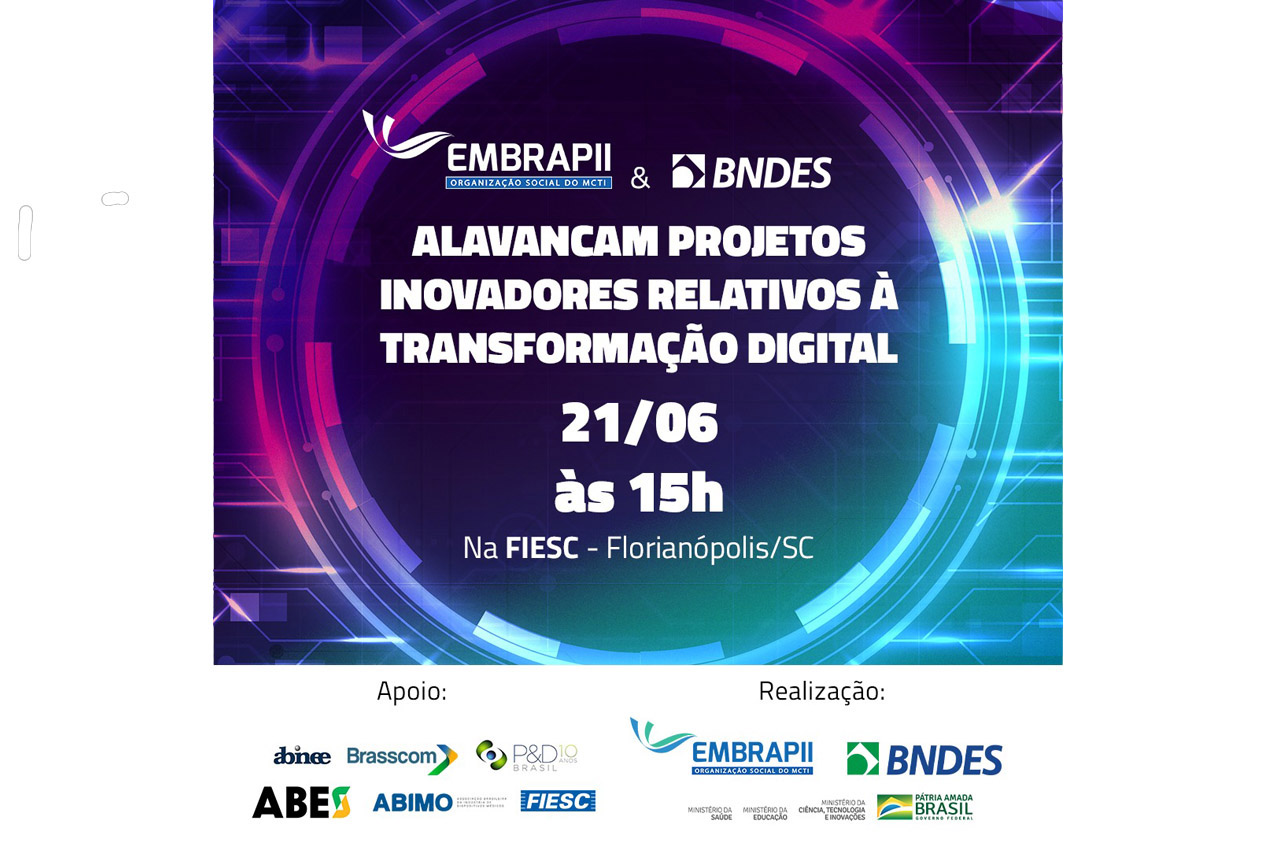 Florianópolis, 15.6.2022 - A Empresa Brasileira de Pesquisa e Inovação Industrial (EMBRAPII), em parceria com o Banco Nacional do Desenvolvimento Social (BNDES), lançam parceria, na próxima terça (21), focada no desenvolvimento de inovações de Tecnologias da Informação e Comunicação (TIC). O anúncio ocorrerá na sede da Federação das Indústrias do Estado de Santa Catarina (FIESC), em Florianópolis, e contará com a presença representantes do governo, pesquisadores e setor industrial para debater os desafios e oportunidades. O Instituto SENAI de Inovação em Sistemas Embarcados, sediado em Florianópolis, será uma das unidades Embrapii a apresentar sua competências para o desenvolvimento de projetos na área.