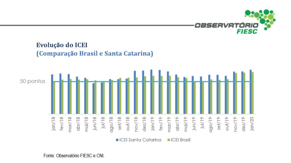 Florianópolis, 23.1.2020 – O Índice de Confiança do Empresário Industrial Catarinense (ICEI) em janeiro registrou 68,2 pontos. O resultado está levemente abaixo do registrado no mesmo mês de 2019 (68,5 pontos), informa pesquisa da Observatório FIESC, divulgada nesta quinta-feira (23). O resultado positivo do primeiro mês do ano foi influenciado pela melhora da percepção das condições atuais da economia e das expectativas futuras. O desempenho catarinense está em linha com o resultado nacional, que no período foi de 65,3 pontos, o maior valor desde junho de 2010. Valores acima de 50 pontos indicam perspectiva otimista. Abaixo de 50 pontos, pessimista. Veja aqui a pesquisa completa