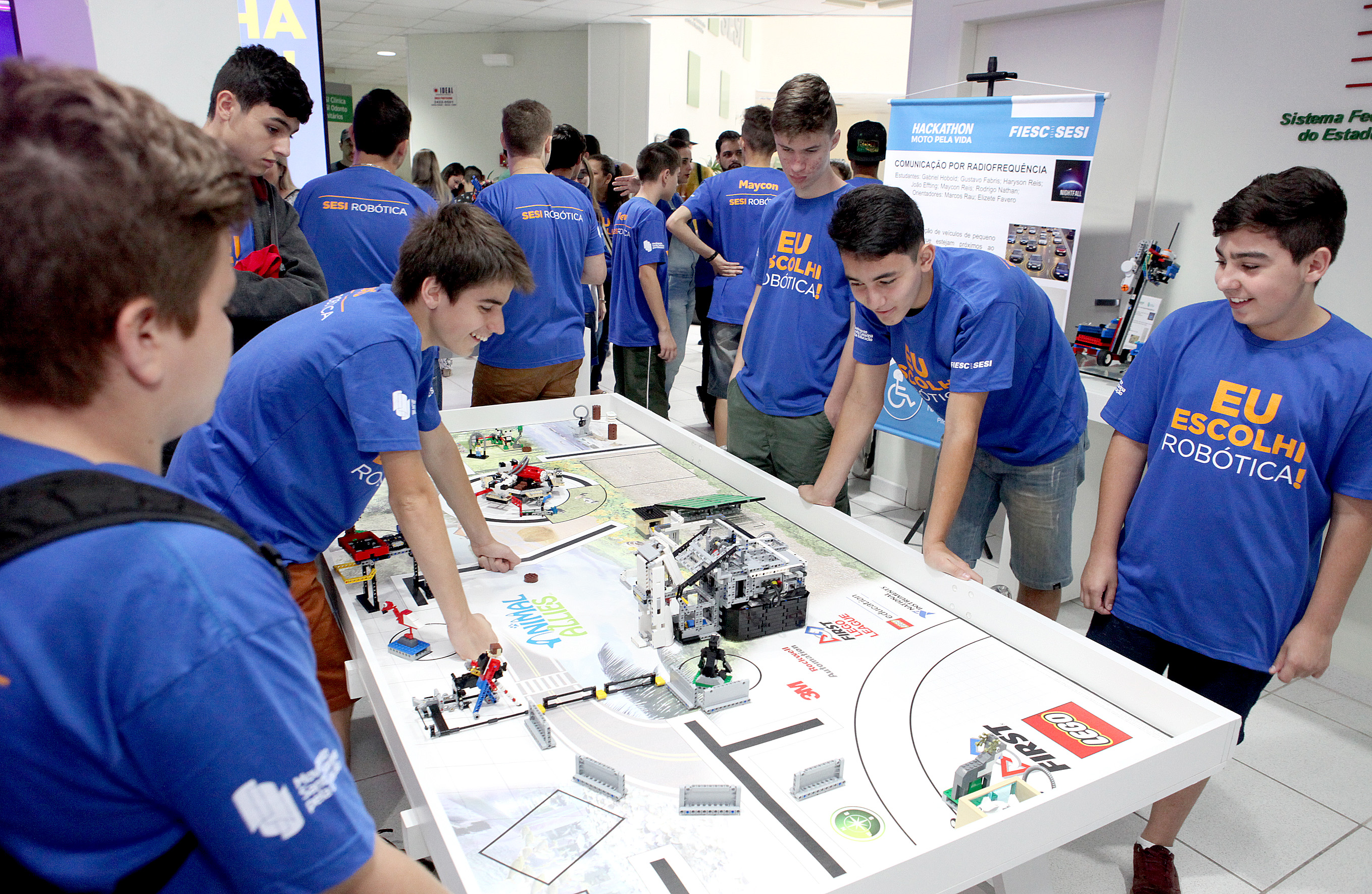 Joinville, 15.12.2016 - Alegria e sensação de dever cumprido marcaram a Mostra de Robótica realizada nesta quarta-feira, dia 14, no SESI em Joinville. A exposição reuniu os trabalhos de 200 estudantes de escolas públicas da cidade que, no contraturno, participaram das aulas de robótica do SESI, entidade da FIESC, em 2016.
