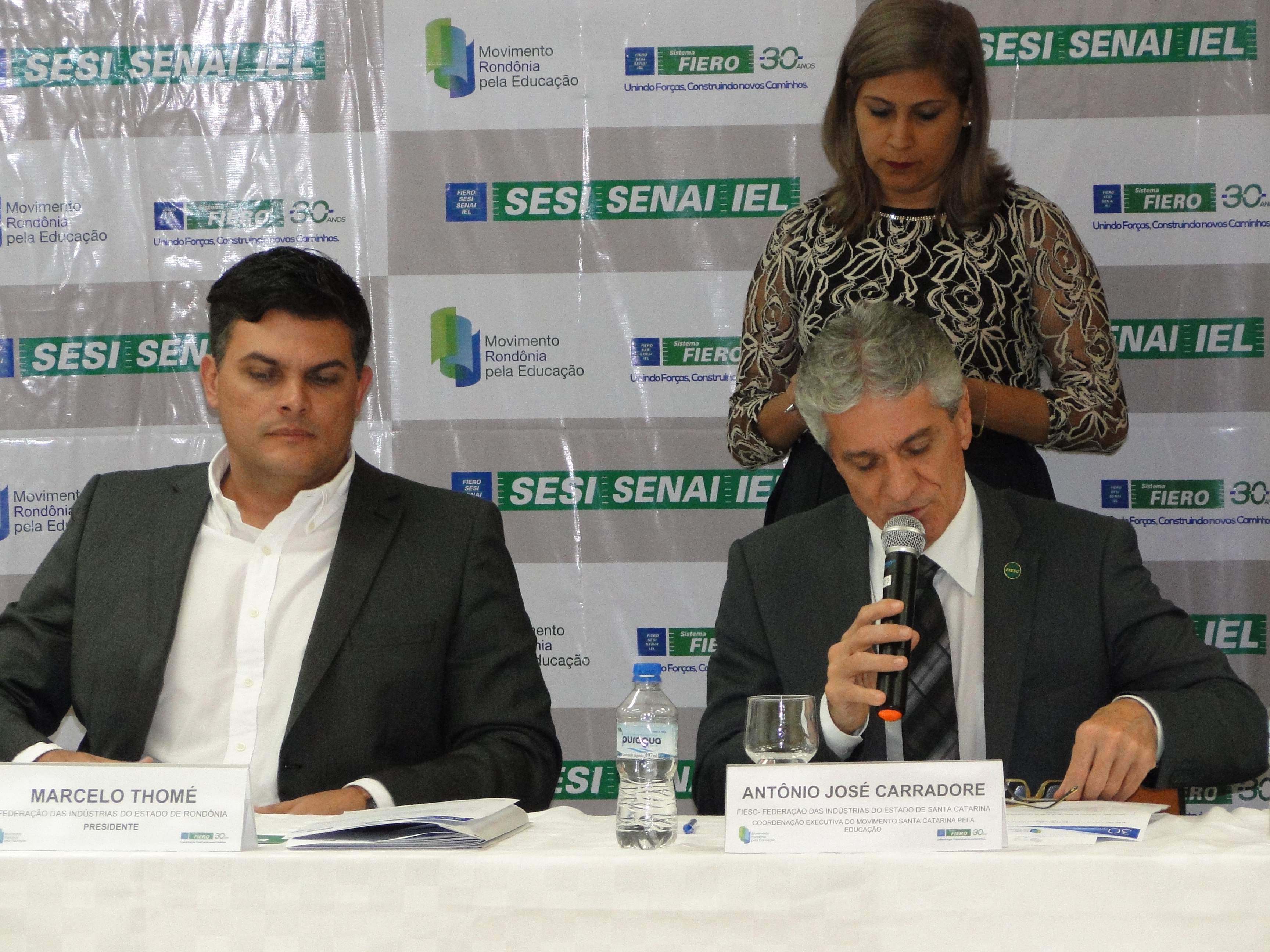 Thomé lembrou que a ideia de lançar o Movimento em Rondônia foi um desafio, uma provocação da então secretária de Educação, Fátima Gavioli, concitando a FIERO a replicar no Estado o então Movimento Indústria pela Educação, lançado pela Federação das Indústrias de Santa Catarina em 2012. “Aproveito para agradecer a generosidade do amigo Glauco Côrte, presidente da FIESC, que nos repassou toda a expertise e disponibilizou colaboradores que nos auxiliaram na implantação do movimento em Rondônia”, exultou. Em Santa Catarina, com a adesão das federações empresariais do comércio (FECOMÈRCIO), agricultura (FAESC) e transporte (FETRANCESC), a iniciativa passou a se chamar Santa Catarina pela Educação.