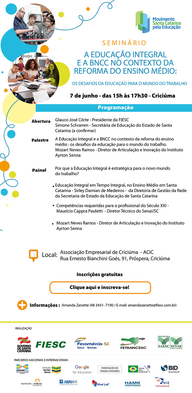 Florianópolis, 04.6.2018 – O Movimento Santa Catarina pela Educação, em parceria com a Secretaria de Estado da Educação (SED) e com o SESC/SC, promove em todas as regiões do Estado encontros para debater os desafios da educação para o mundo do trabalho. Os eventos serão realizados em seis regionais e abordarão A Educação Integral e a Base Nacional Comum Curricular (BNCC) no contexto da Reforma do Ensino Médio: Os Desafios da Educação para o Mundo do Trabalho. O primeiro encontro ocorre nesta quinta-feira (7), na Associação Comercial e Industrial de Criciúma (ACIC), às 15 horas, com o presidente da FIESC, Glauco José Côrte, e o diretor do Instituto Ayrton Senna, Mozart Ramos. Interessados podem se inscrever aqui.